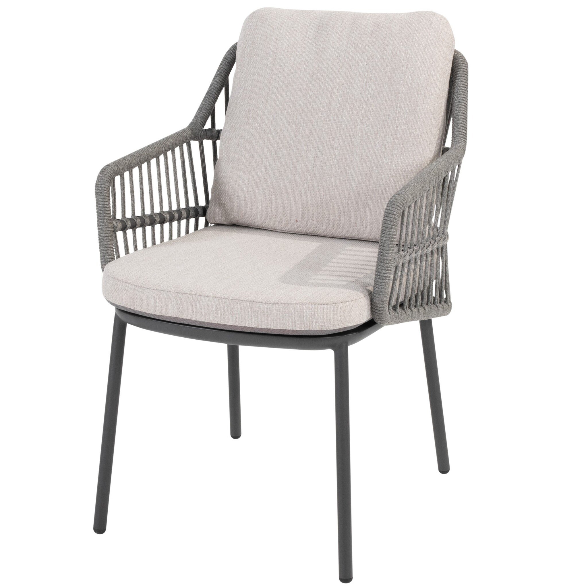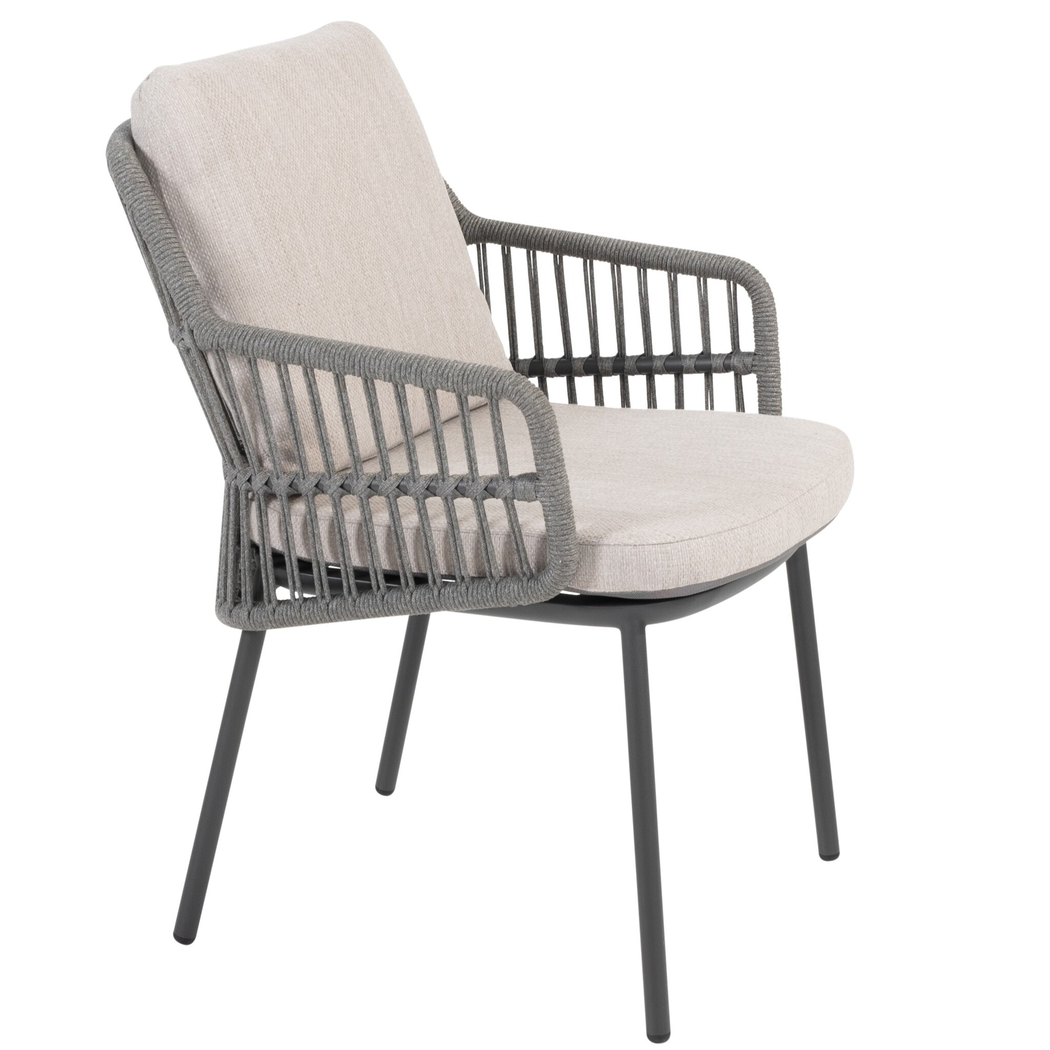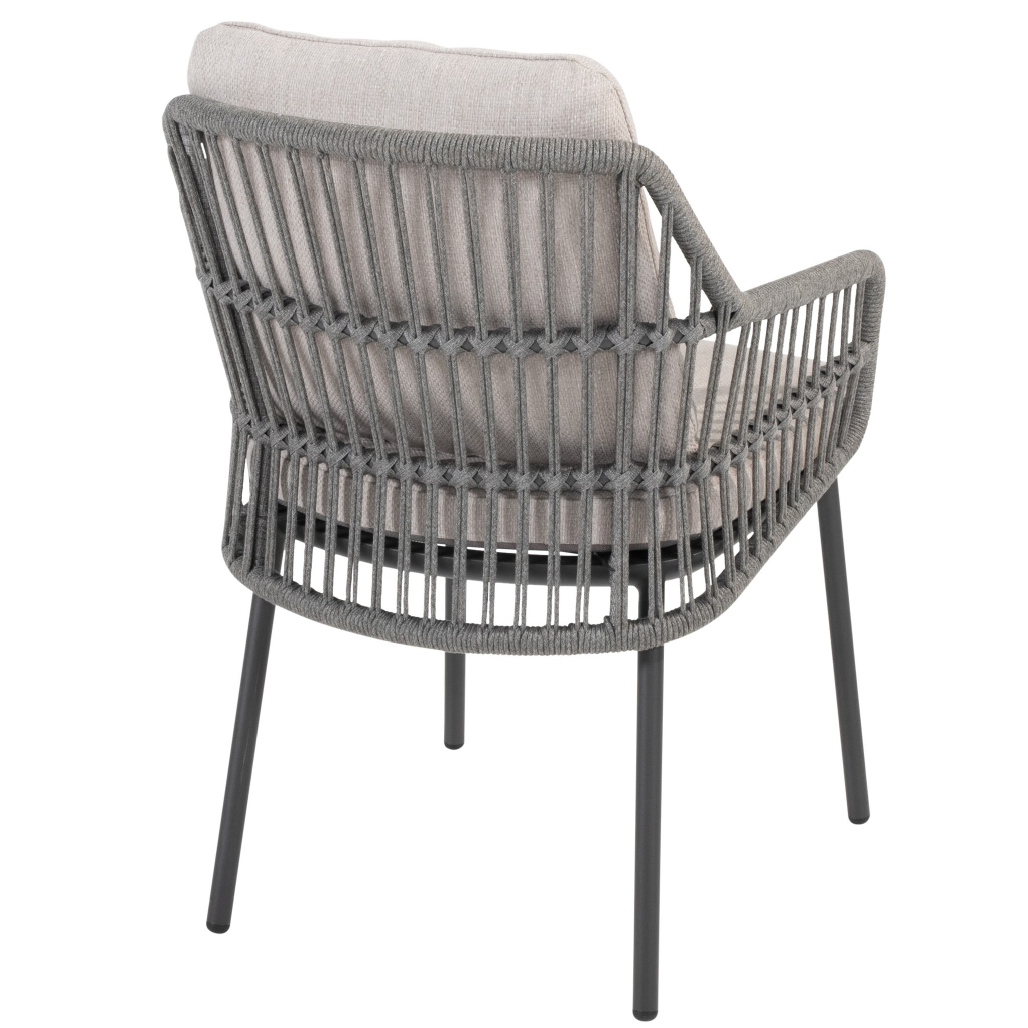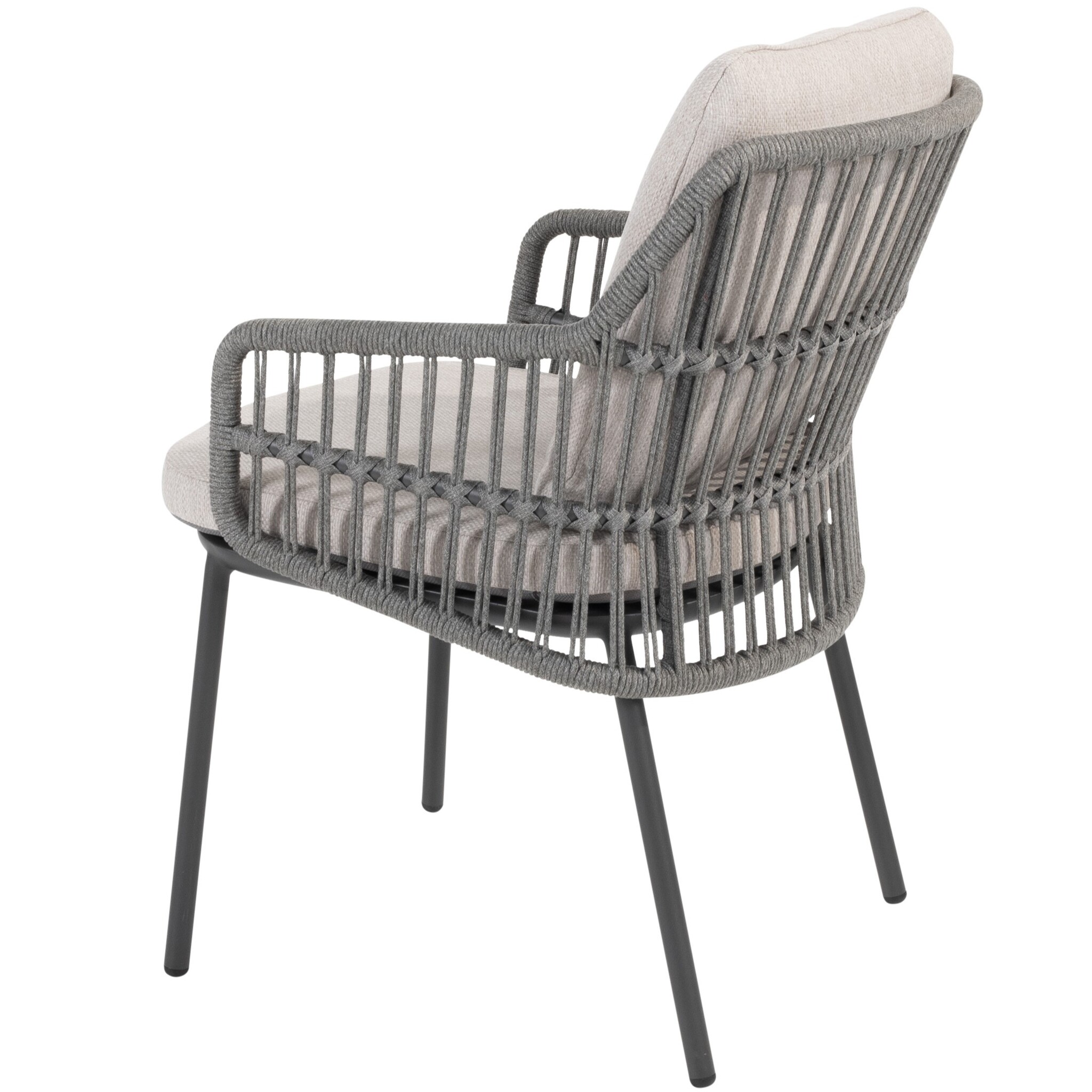De zijkanten en rugleuning zijn stijlvol afgewerkt met rope in de kleur grijs. Dit gevlochten touw geeft de stoel niet alleen een eigentijdse, speelse uitstraling, maar zorgt ook voor flexibiliteit en extra zitcomfort. Het rope is weerbestendig en kleurvast, waardoor de stoel jarenlang zijn luxe uitstraling behoudt.