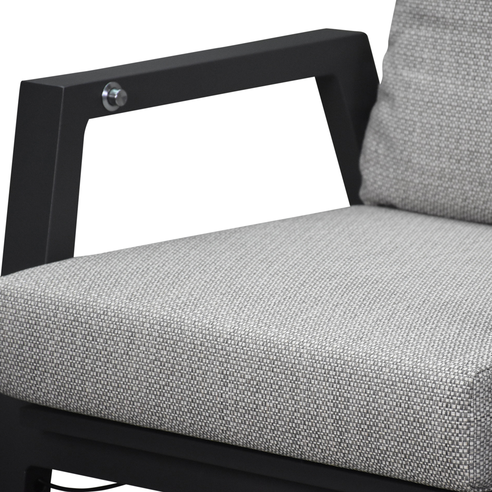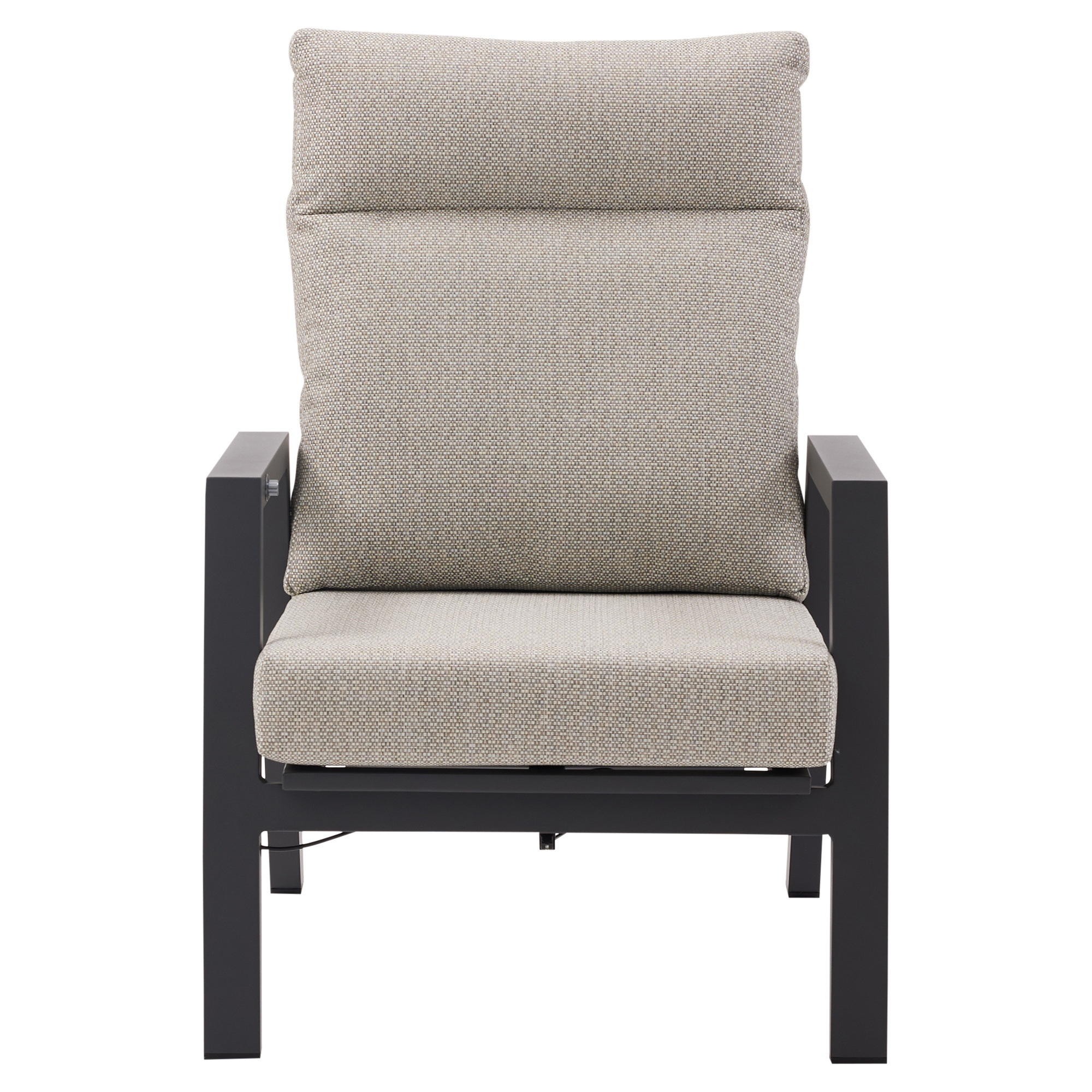 Het bijzondere aan de Barolo loungeset is dat alle rugleuningen verstelbaar zijn. Op de armleuningen zit een knop en als je die indrukt en met je rug tegen de leuning duwt, gaat de rugleuning traploos naar achteren. Dit komt doordat er een gasveer in het frame is verwerkt.