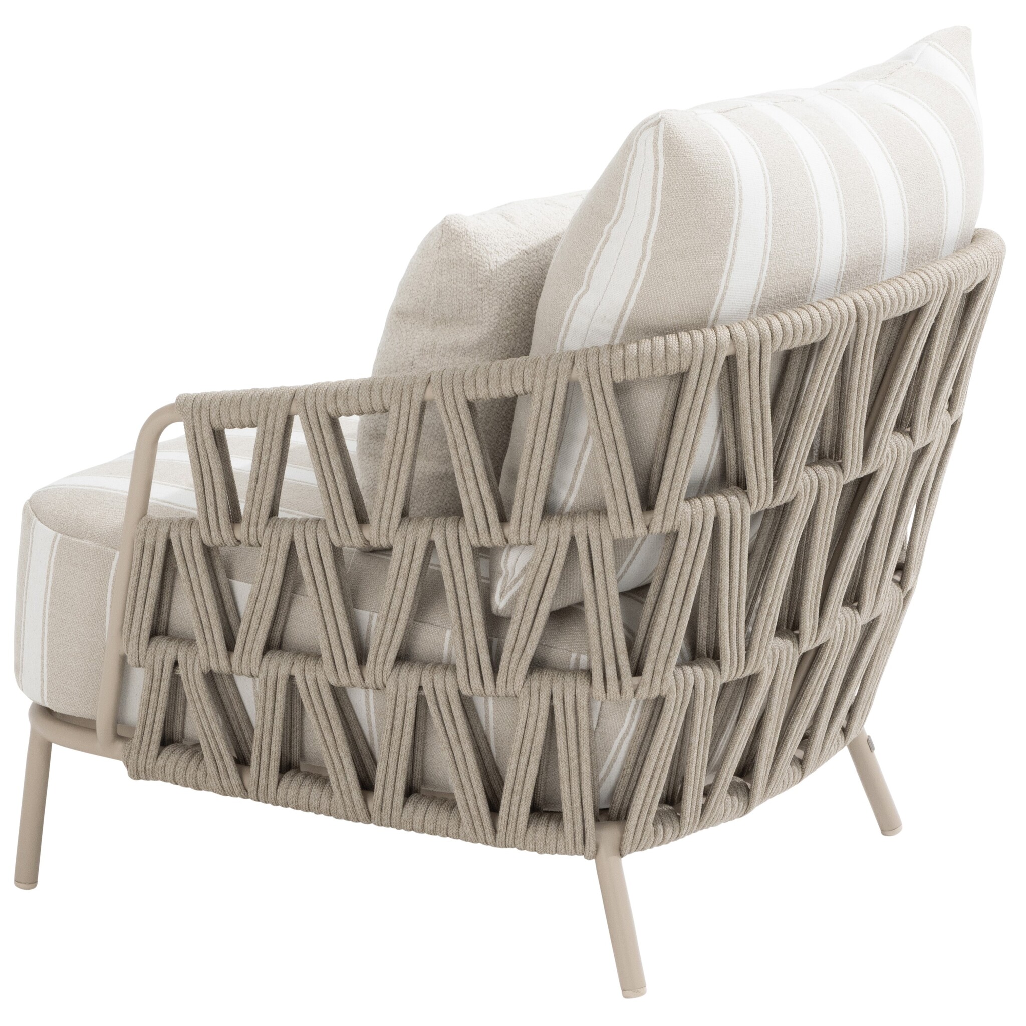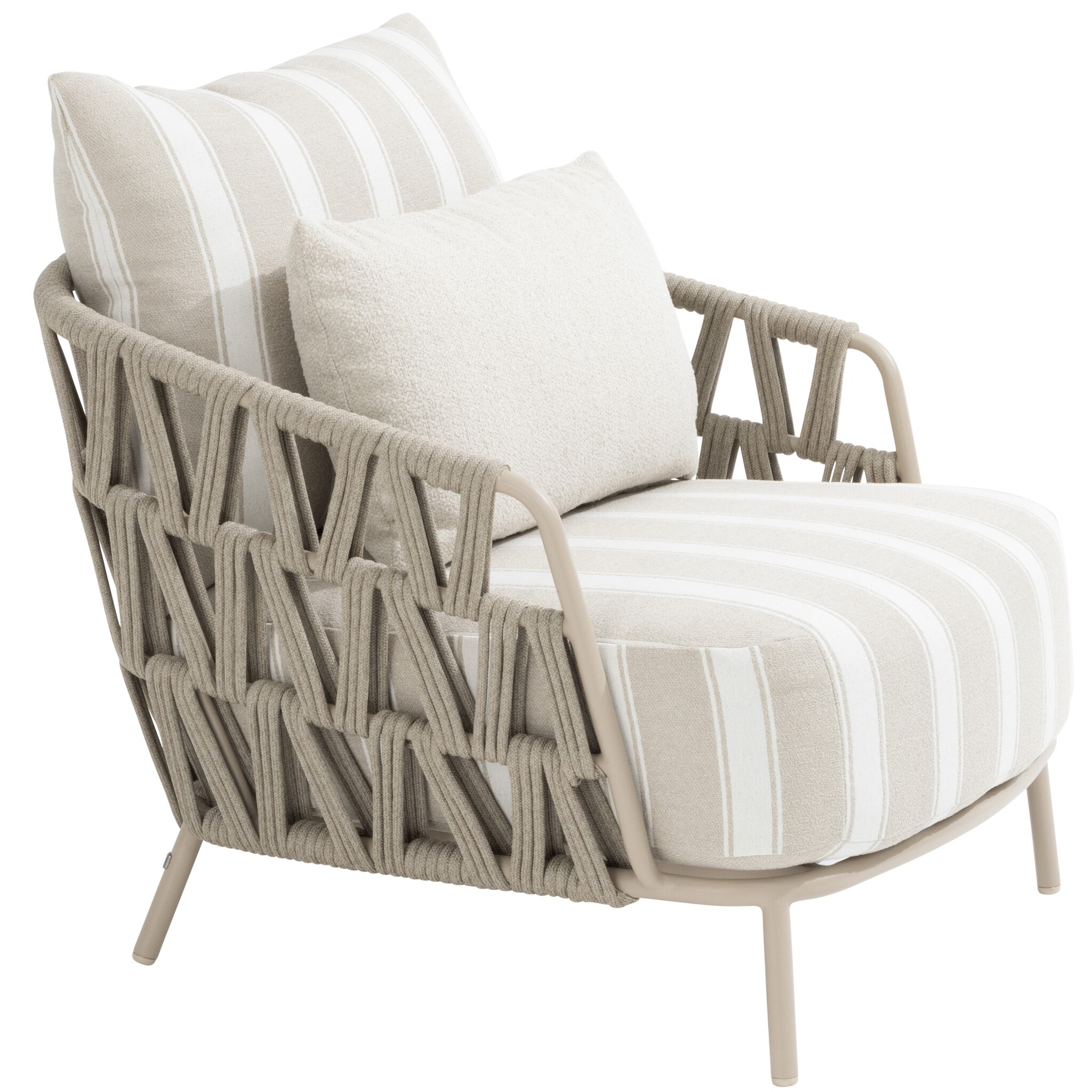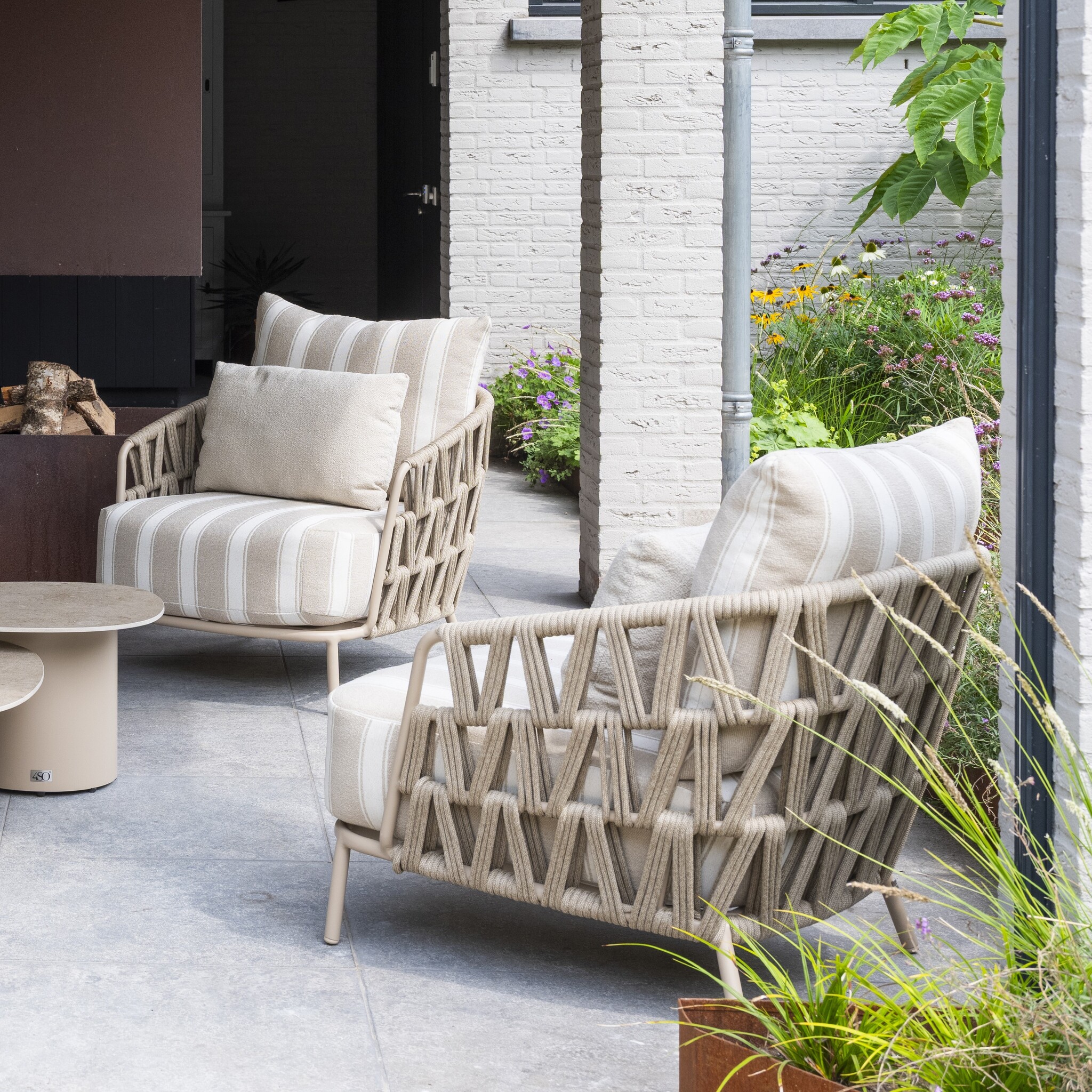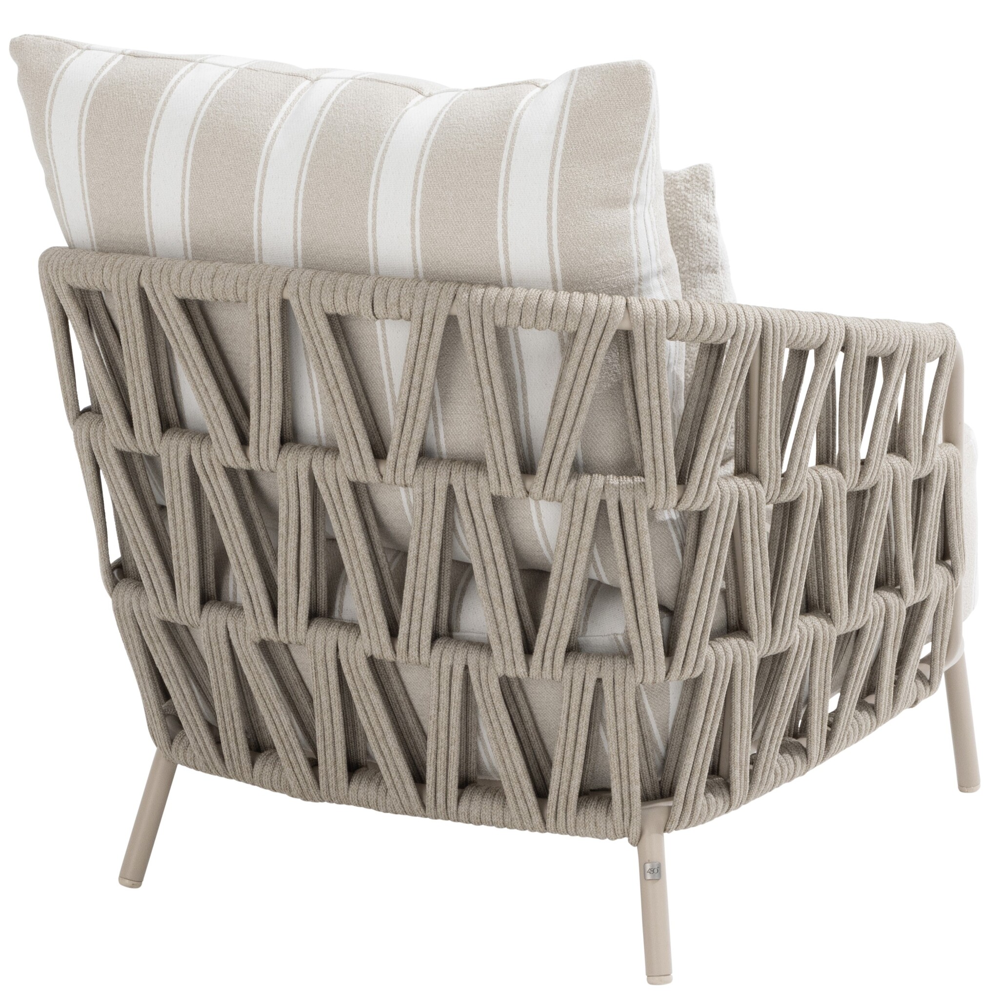 De rug- en armleuningen zijn vakkundig afgewerkt met hoogwaardig rope, kunstig gevlochten voor een eigentijdse en luchtige look. Deze afwerking zorgt niet alleen voor een mooie uitstraling, maar ook voor extra ondersteuning en comfort.