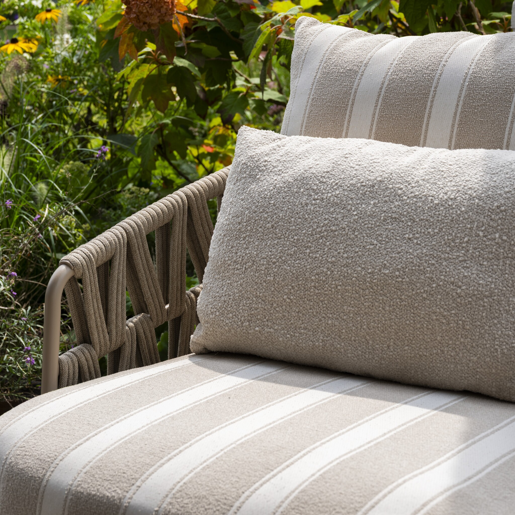 De rug- en armleuningen zijn vakkundig afgewerkt met hoogwaardig rope, kunstig gevlochten voor een eigentijdse en luchtige look. Deze afwerking zorgt niet alleen voor een mooie uitstraling, maar ook voor extra ondersteuning en comfort.
