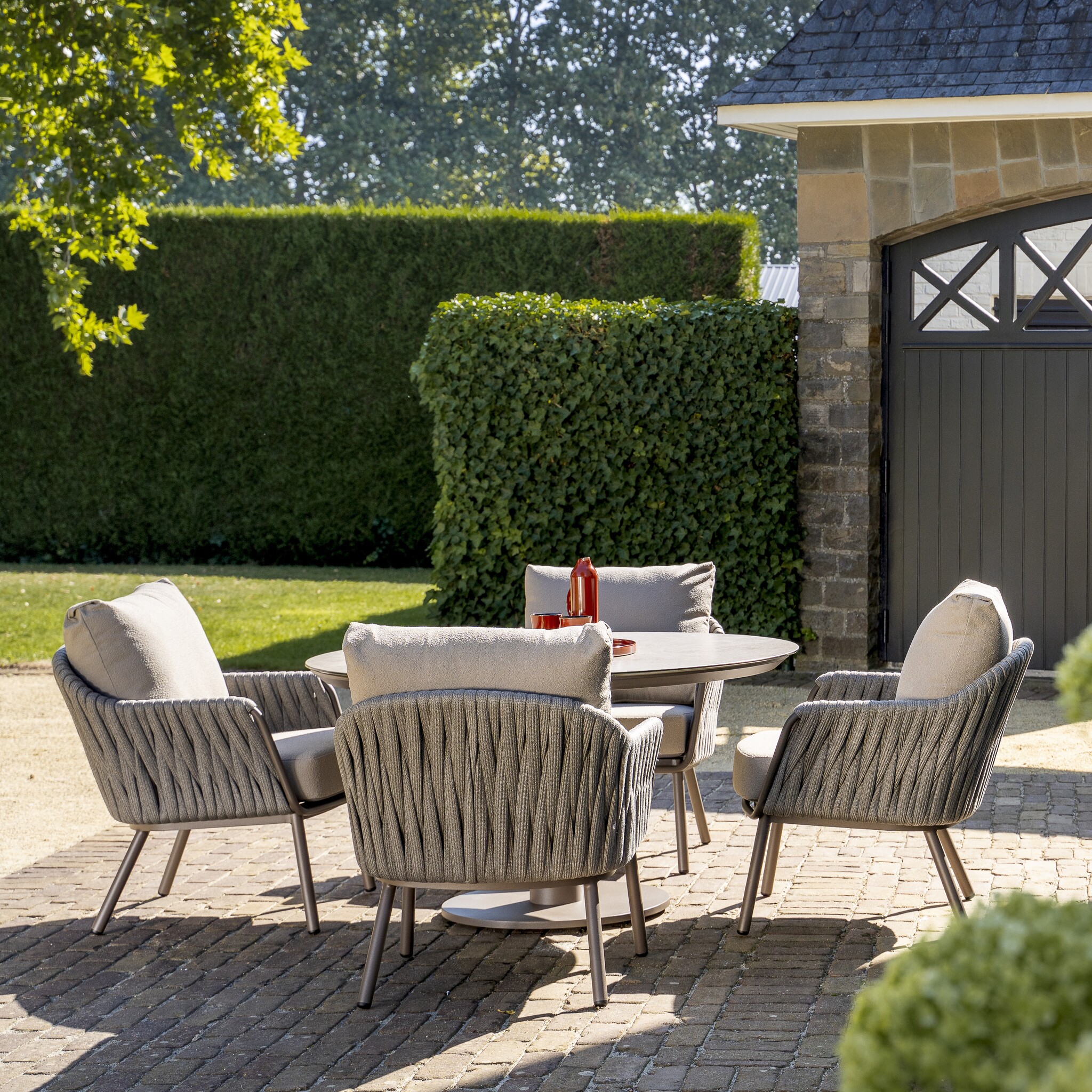 De Cannes low dining stoel onderscheidt zich door zijn verfijnde vormgeving en harmonieuze materiaalcombinatie. Het stevige frame is gemaakt van gepoedercoat aluminium in de kleur terre, een elegante taupe-tint die warmte en rust uitstraalt. Rondom de rugleuning en armleuningen is de stoel met de hand afgewerkt met een brede, luxe rope in grijs, wat zorgt voor een verfijnd, ambachtelijk karakter.