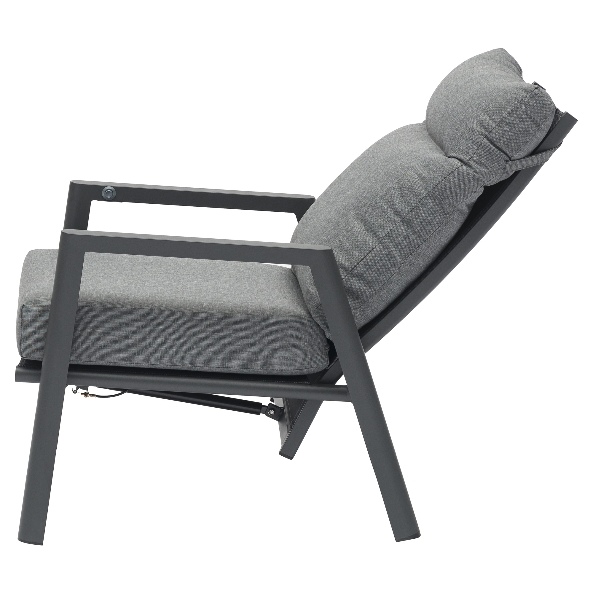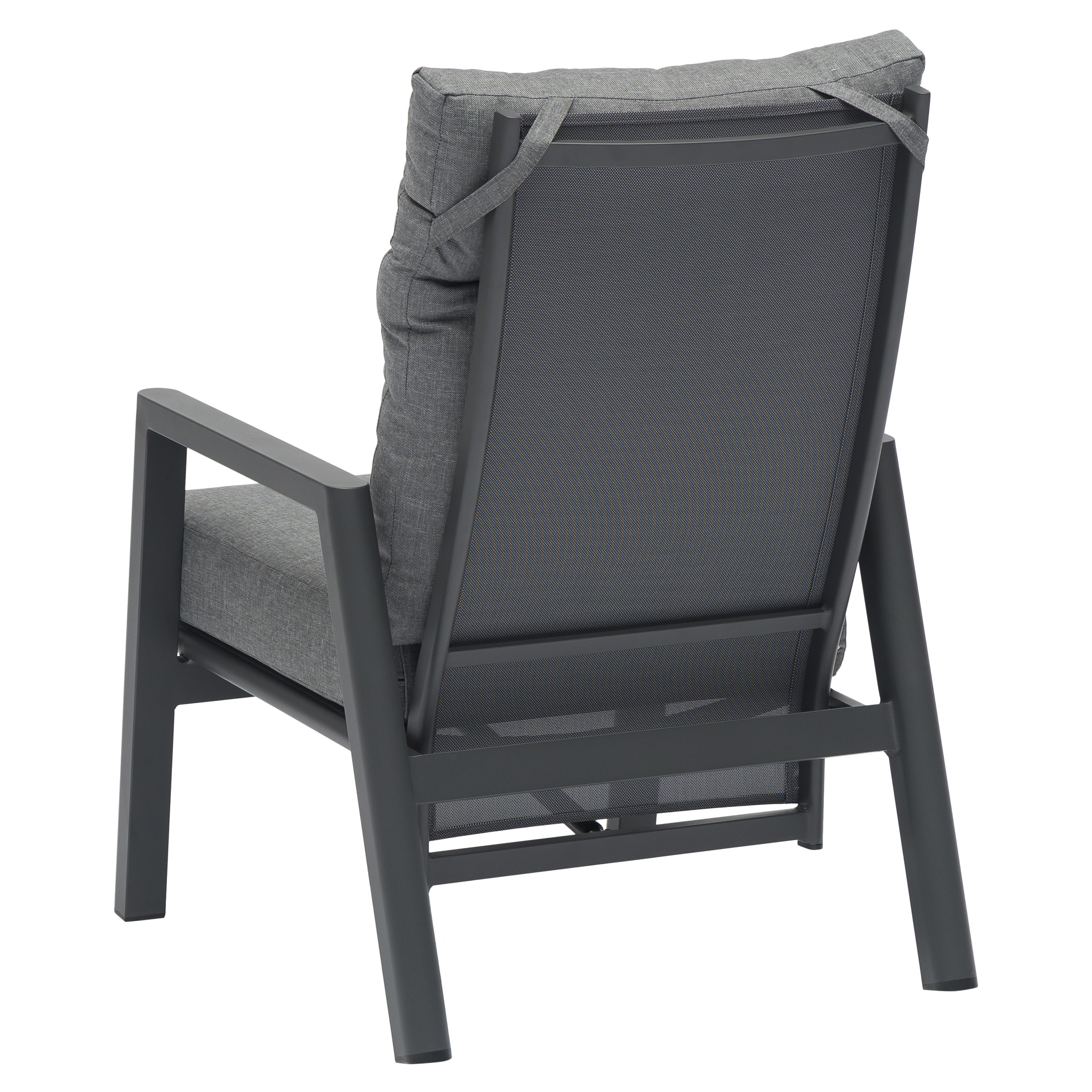Het sterke aluminium frame in dark grey geeft de stoel een luxe, eigentijdse uitstraling én maakt hem licht van gewicht en onderhoudsvriendelijk. Dankzij de verstelbare rugleuning vindt u moeiteloos de ideale zit- of loungepositie, of u nu wilt lezen, zonnen of volledig wilt ontspannen.