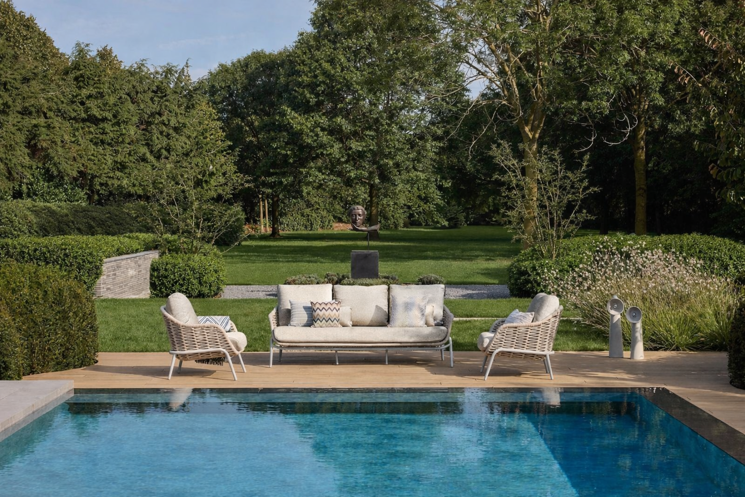 De zachte rondingen en het verfijnd handgevlochten rope geven de set een vriendelijke, uitnodigende uitstraling. Het slanke aluminium frame in de warme kleur Camel Sand zorgt voor een luchtig silhouet, terwijl de royale kussens in Beachy Bouclé een rijk en comfortabel zitgevoel bieden. Hier kom je niet alleen zitten — hier blijf je zitten.