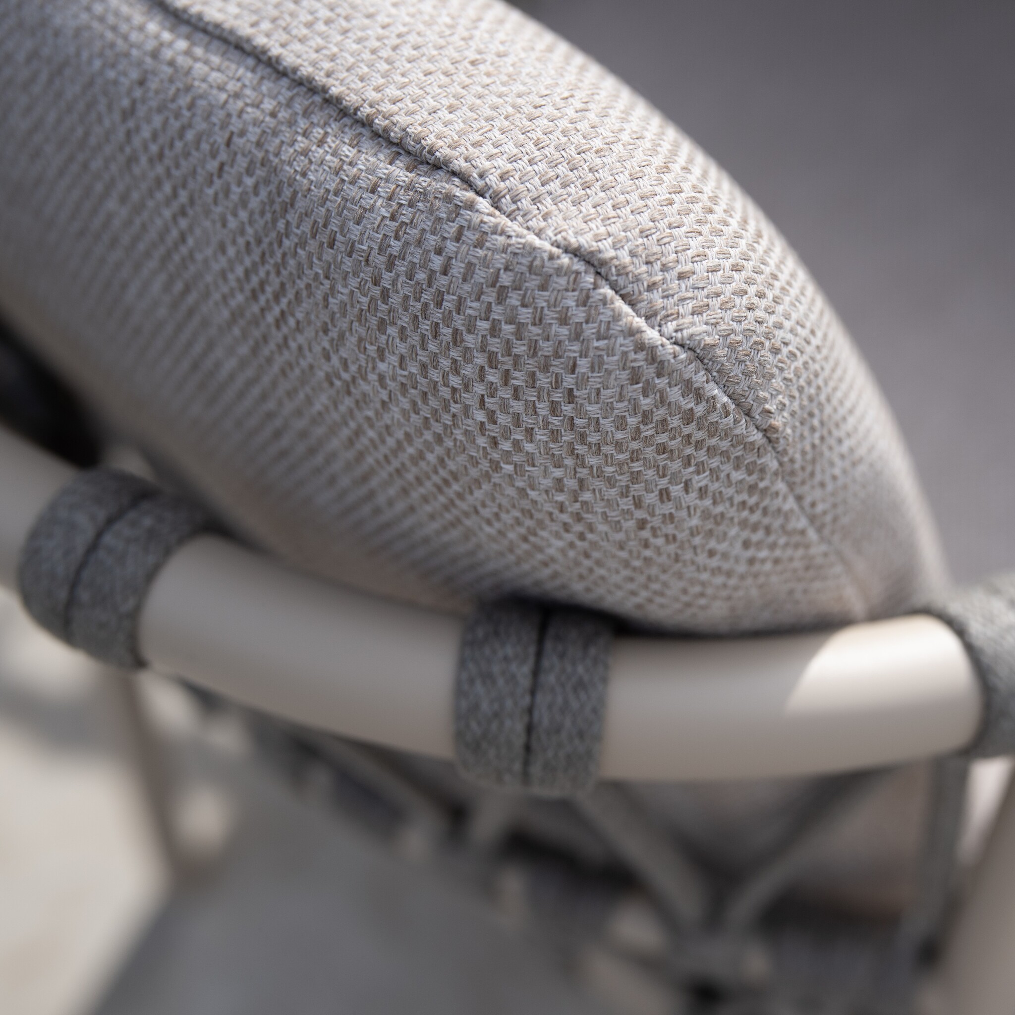 Het frame is gemaakt van duurzaam gepoedercoat aluminium in de warme kleur Latte, wat zorgt voor een elegante, weerbestendige basis. De rugleuning en armleuningen zijn afgewerkt met hoogwaardig rope in de kleur grijs, dat niet alleen een eigentijdse uitstraling geeft, maar ook zorgt voor extra comfort en flexibiliteit.