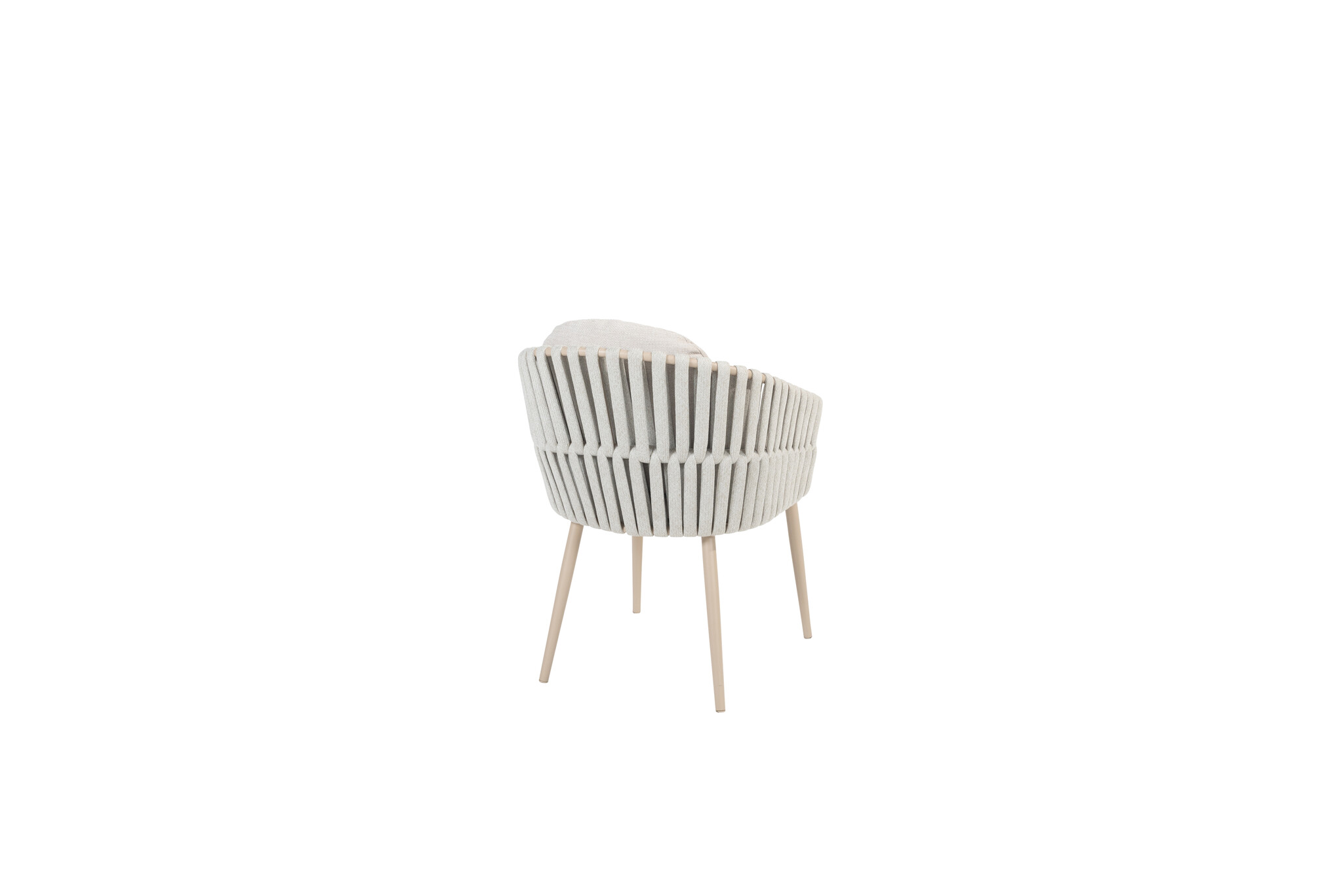 De Eva dining tuinstoel is een moderne tuinstoel uitgevoerd met all weather buitenkussens. Het prachtige design maakt de Eva tuinstoel uniek. Het rvs gepoedercoat frame is bekleed is met taupe rope. De kussens blijven goed op zijn plek liggen omdat het frame de kussens mooi omsluit.