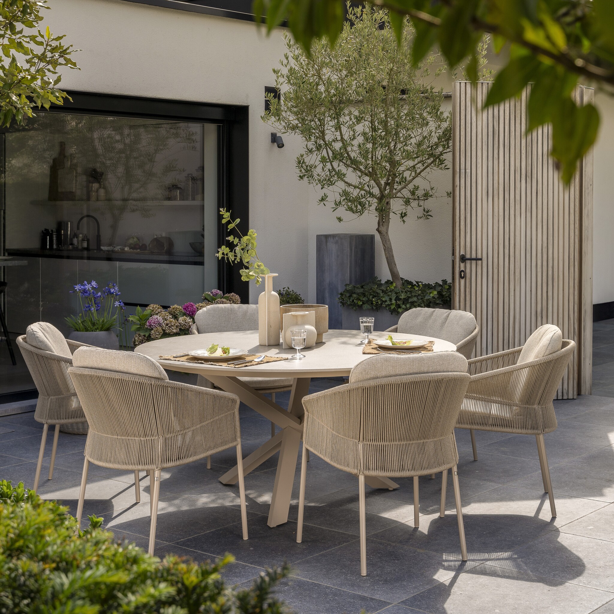 Deze stoel heeft een stevig frame van gepoedercoat aluminium in de kleur Latte, een zachte, moderne tint die prachtig harmonieert met diverse tafelbladen en tuinstijlen. Aluminium is niet alleen sterk en duurzaam, maar ook volledig weerbestendig en onderhoudsarm.
