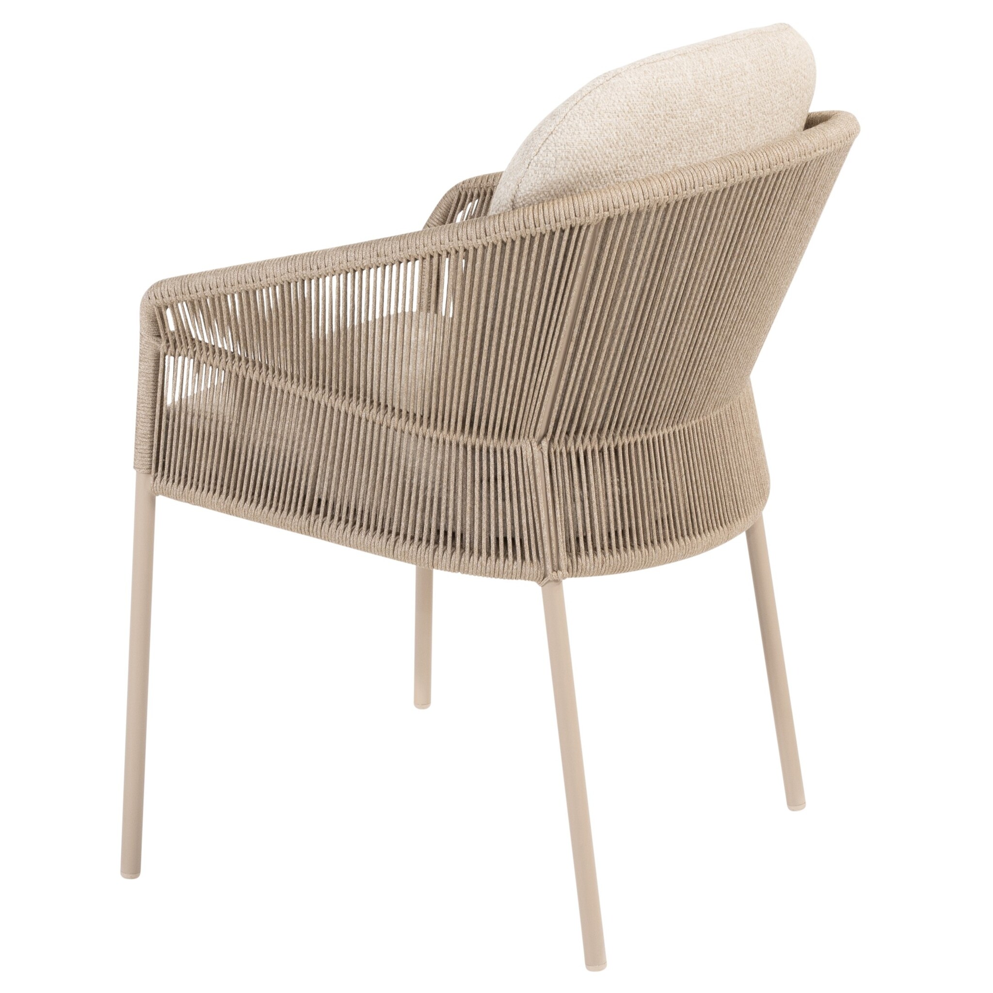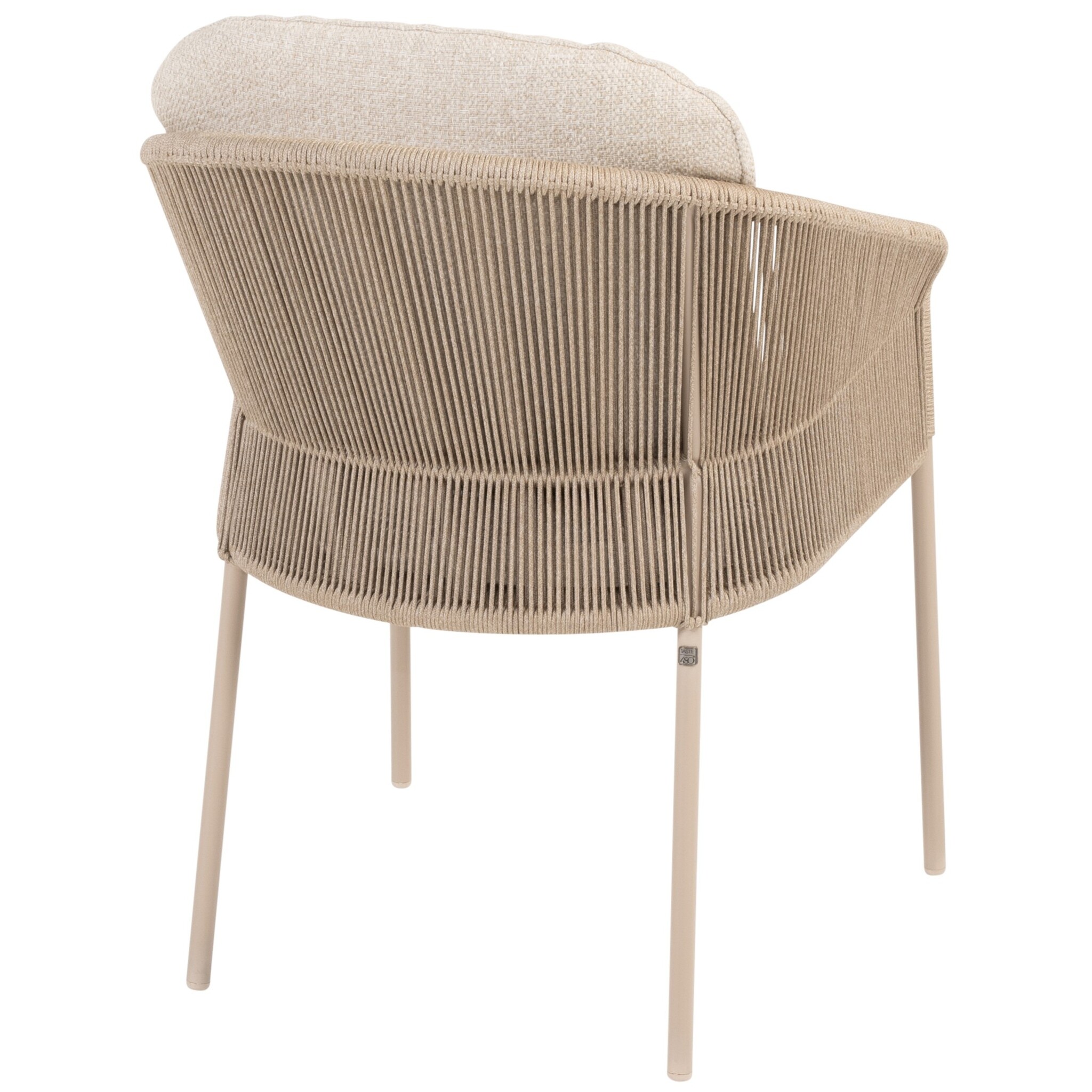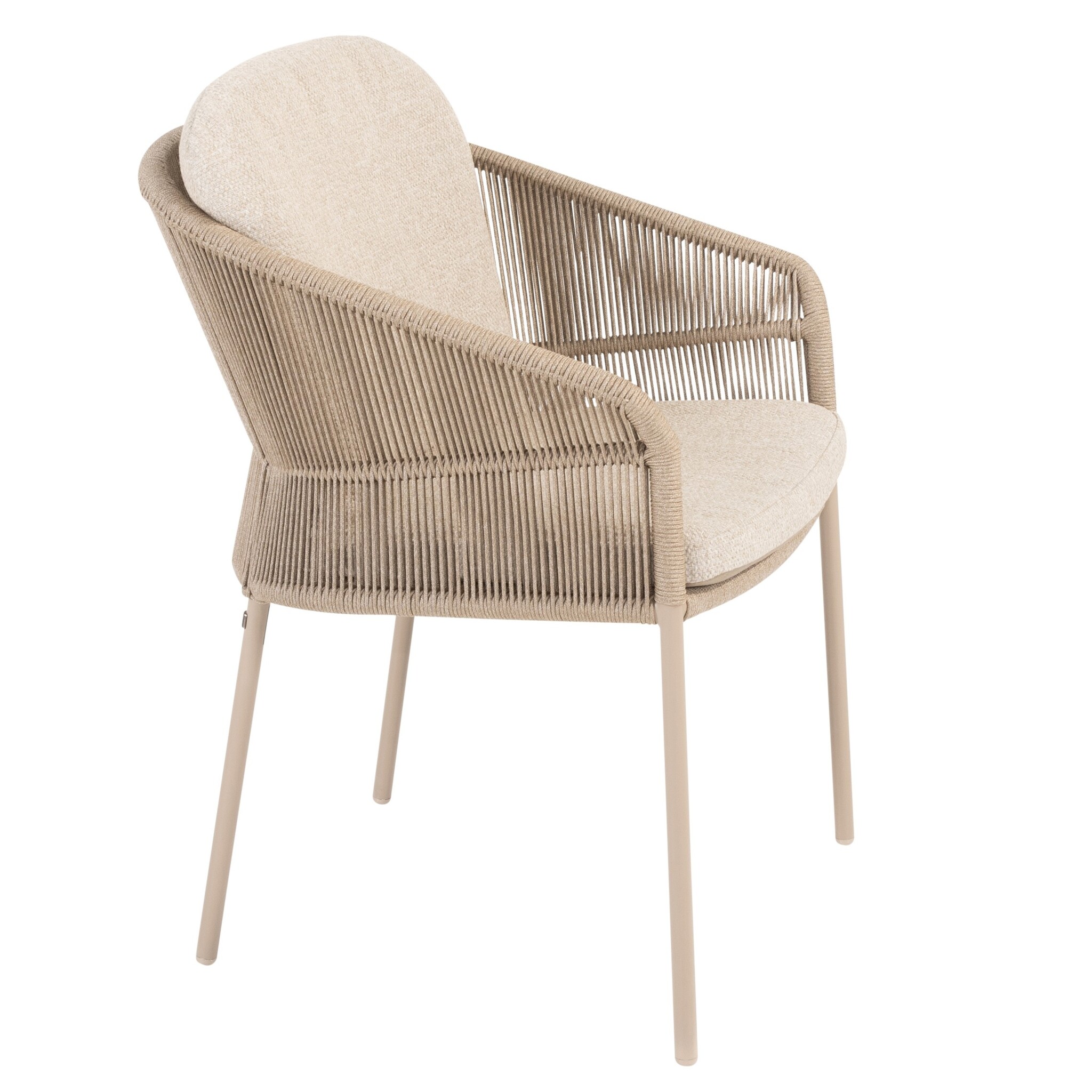 De rugleuning en zijkanten van de Florence zijn met de hand gevlochten van hoogwaardig rope in de kleur Taupe. Dit touw is speciaal ontwikkeld voor buitengebruik: het is UV-bestendig, waterafstotend en behoudt zijn vorm en kleur, zelfs bij langdurige blootstelling aan zonlicht. Het open vlechtwerk geeft de stoel bovendien een luchtige en elegante uitstraling, terwijl het tegelijkertijd voldoende ondersteuning biedt.