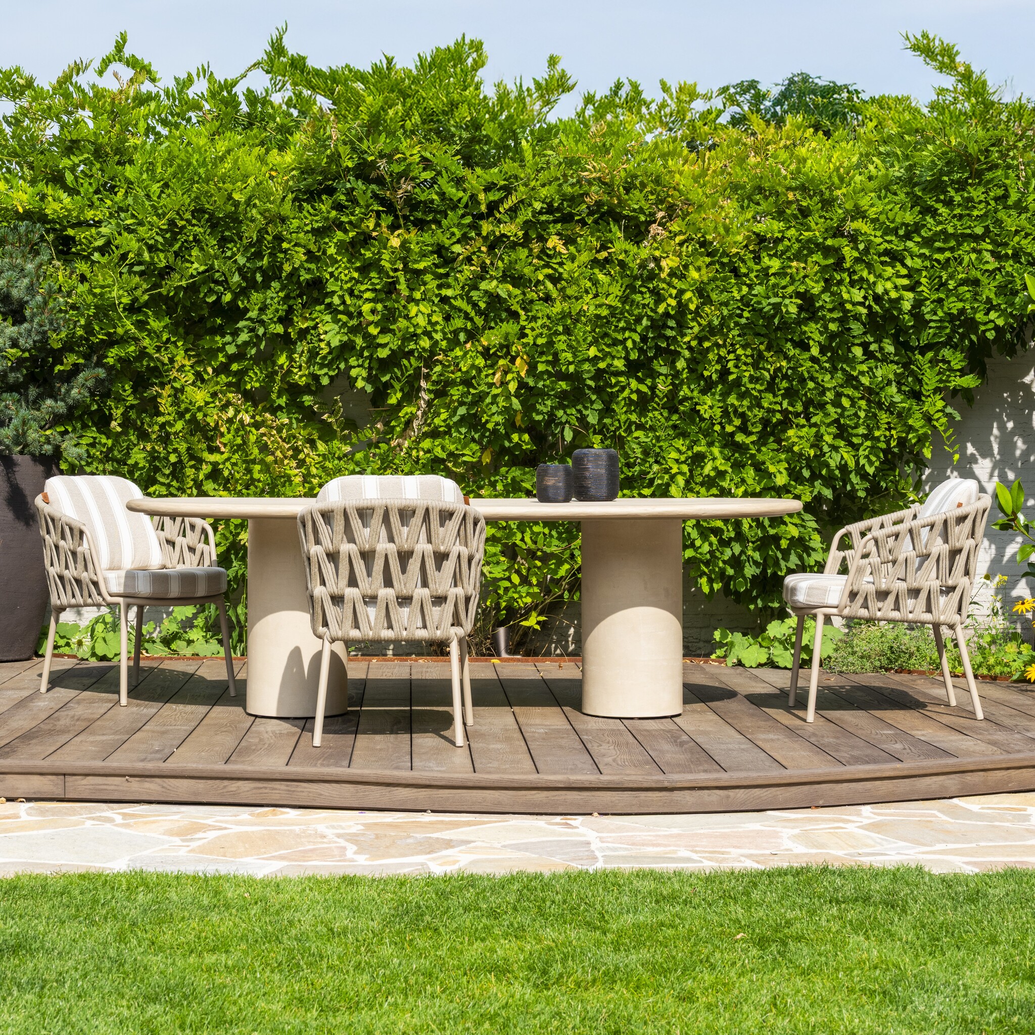 De strakke, afgeronde vormgeving en de stevige cilindervormige poten geven de tafel een eigentijdse en sculpturale uitstraling. De zachte beige tint van het Mortex blad sluit naadloos aan bij uiteenlopende tuin- en terrasstijlen, van modern minimalistisch tot warm mediterraans.