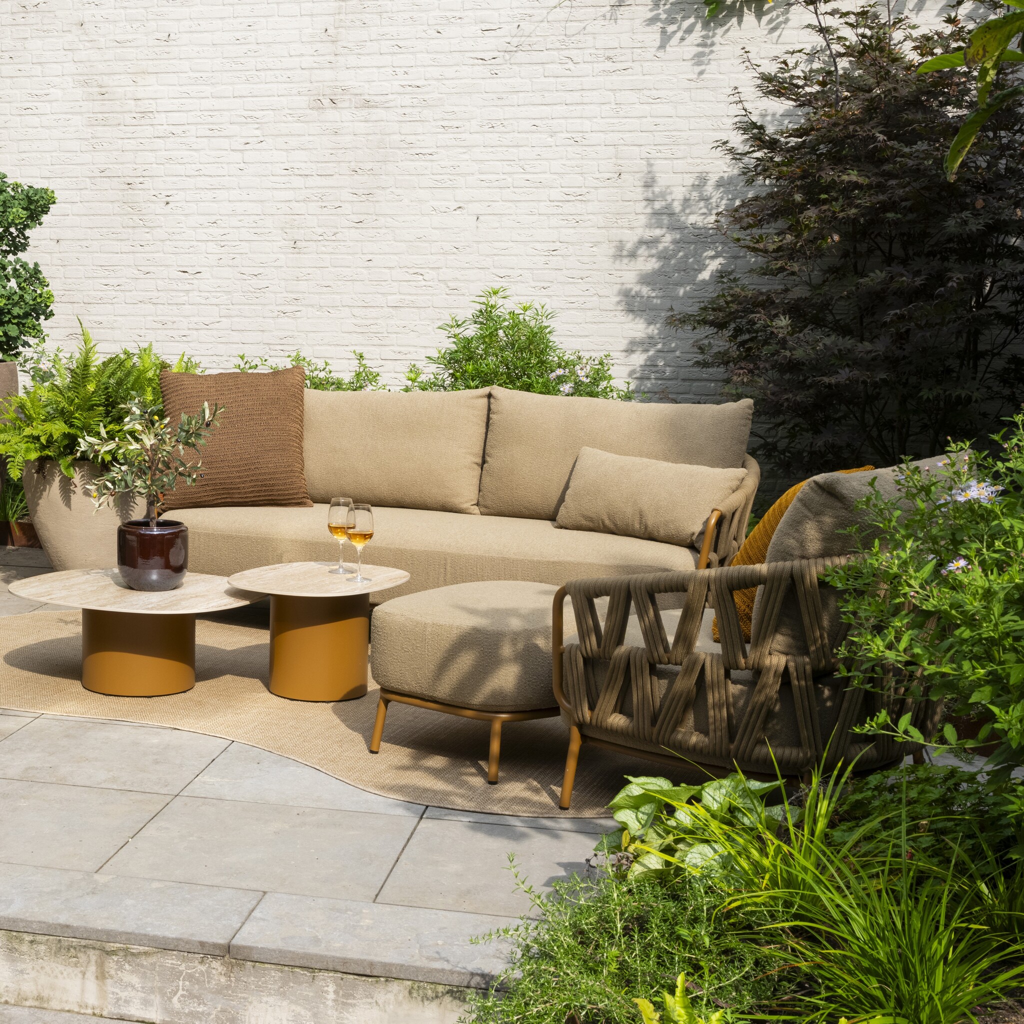 Het stevige gepoedercoat aluminium frame in een warme amber kleur is duurzaam en bestand tegen weer en wind. De rug- en armleuningen zijn prachtig afgewerkt met een handgeweven rope-design, dat zorgt voor een moderne en stijlvolle uitstraling. De extra dikke all-weather kussens geven een zacht en comfortabel zitgevoel en zijn ontworpen om buiten te blijven, ongeacht het seizoen.