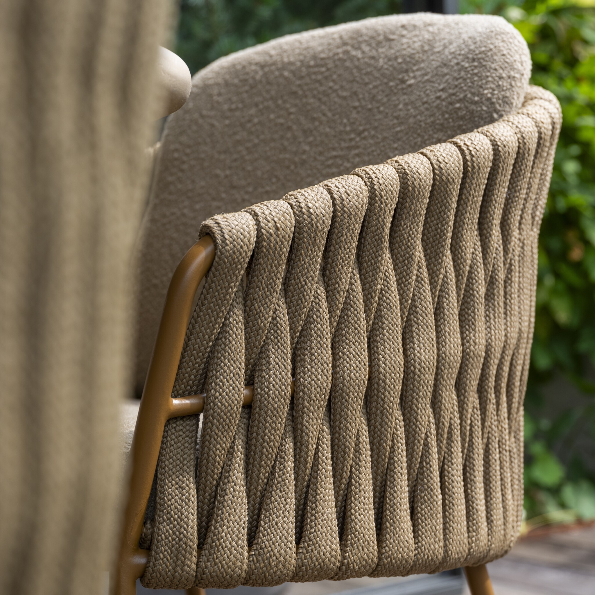 De rug en armleuningen zijn afgewerkt met robuust rope in een elegante bruine tint. Dit geeft de stoel niet alleen een moderne look, maar biedt ook extra comfort en flexibiliteit. Het rope is weerbestendig en onderhoudsvriendelijk, zodat de stoel perfect bestand is tegen alle weersomstandigheden.