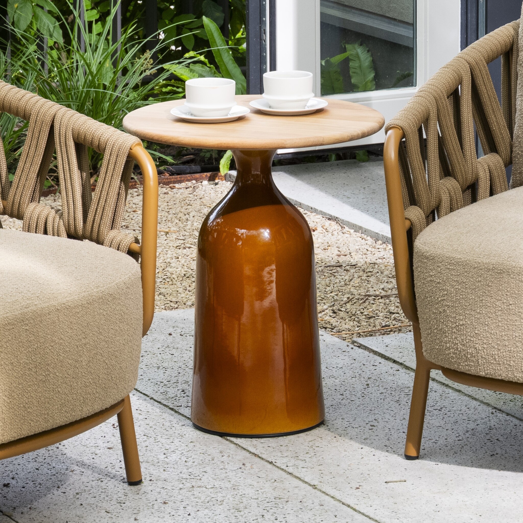 De onderstellen van de June tafels is een echte blikvanger. Ze zijn gemaakt van hoogglans keramiek in een warme caramel kleur. De combinatie van het natuurlijke teak en het glanzende keramiek geven de tafels een moderne, maar tijdloze uitstraling.