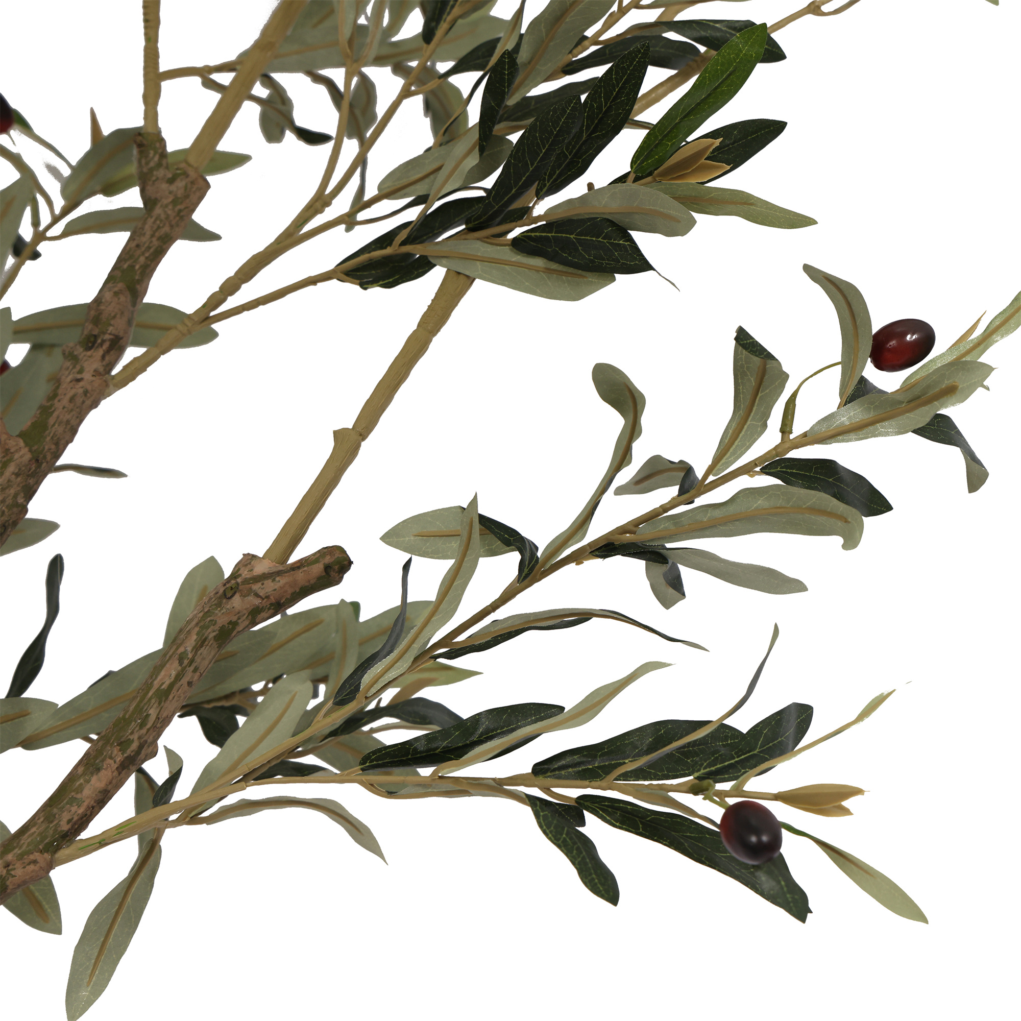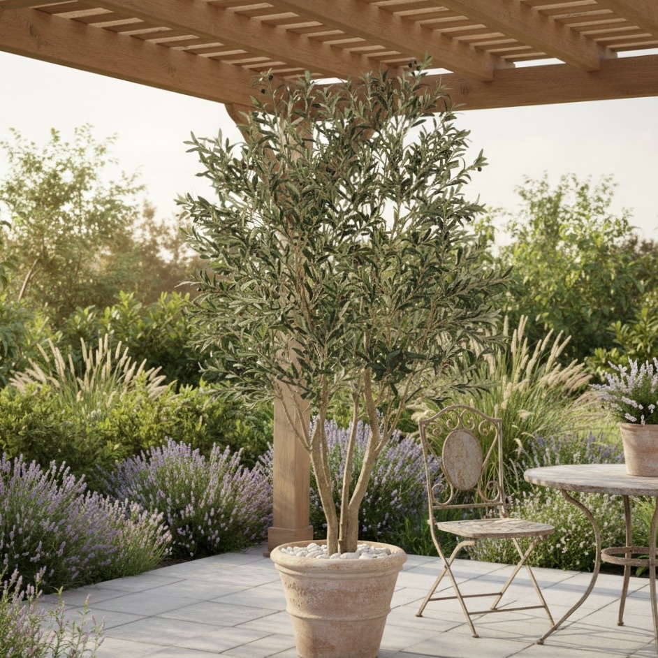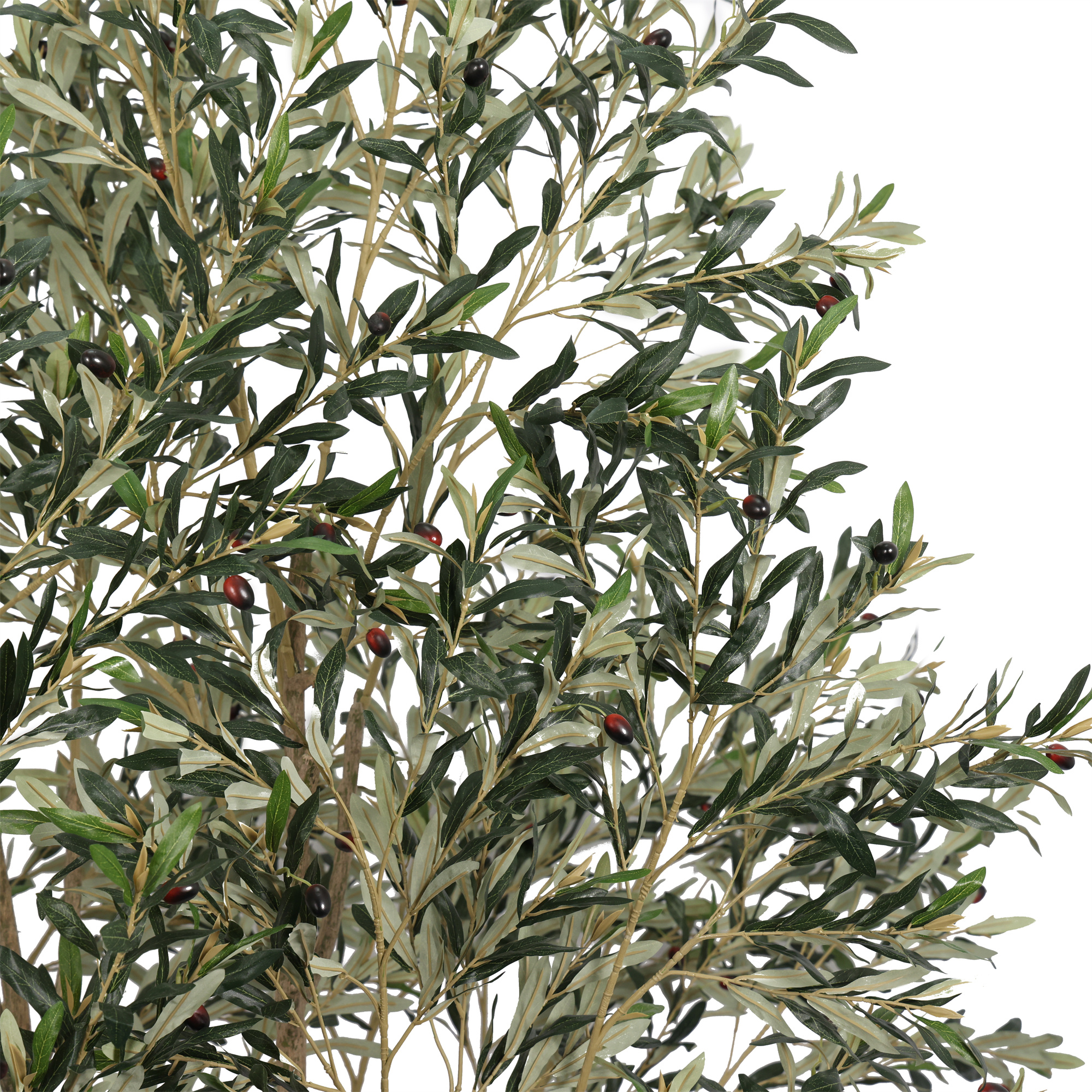 De volle, rijk vertakte kruin met frisgroene, realistisch gevormde bladeren en subtiel verspreide olijven brengt direct een warme, mediterrane sfeer in uw buitenruimte. Dankzij de elegante vorm en natuurlijke proporties vormt deze boom een prachtig contrast met strakke, eigentijdse lijnen en voegt hij tegelijkertijd zachtheid en groen toe aan het geheel.