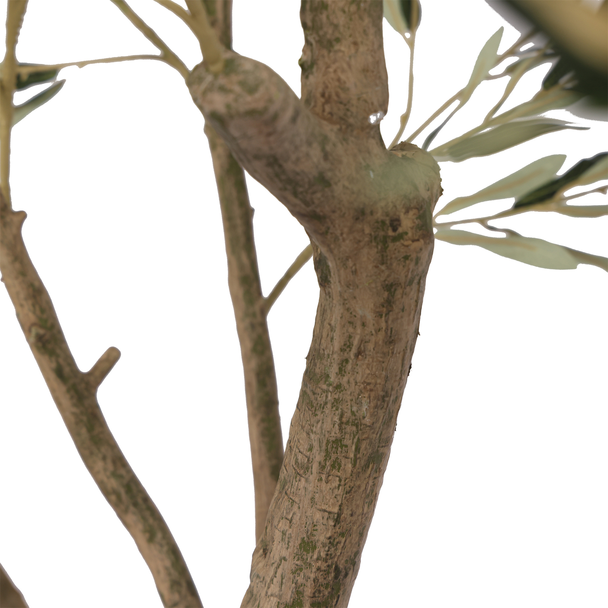 De meerstammige opbouw met natuurlijk gevormde, licht geruwde stammen geeft de boom een authentieke en karaktervolle uitstraling. De zorgvuldig nagemaakte houtstructuur zorgt voor een robuuste, levensechte look die nauwelijks van een echte olijfboom te onderscheiden is.