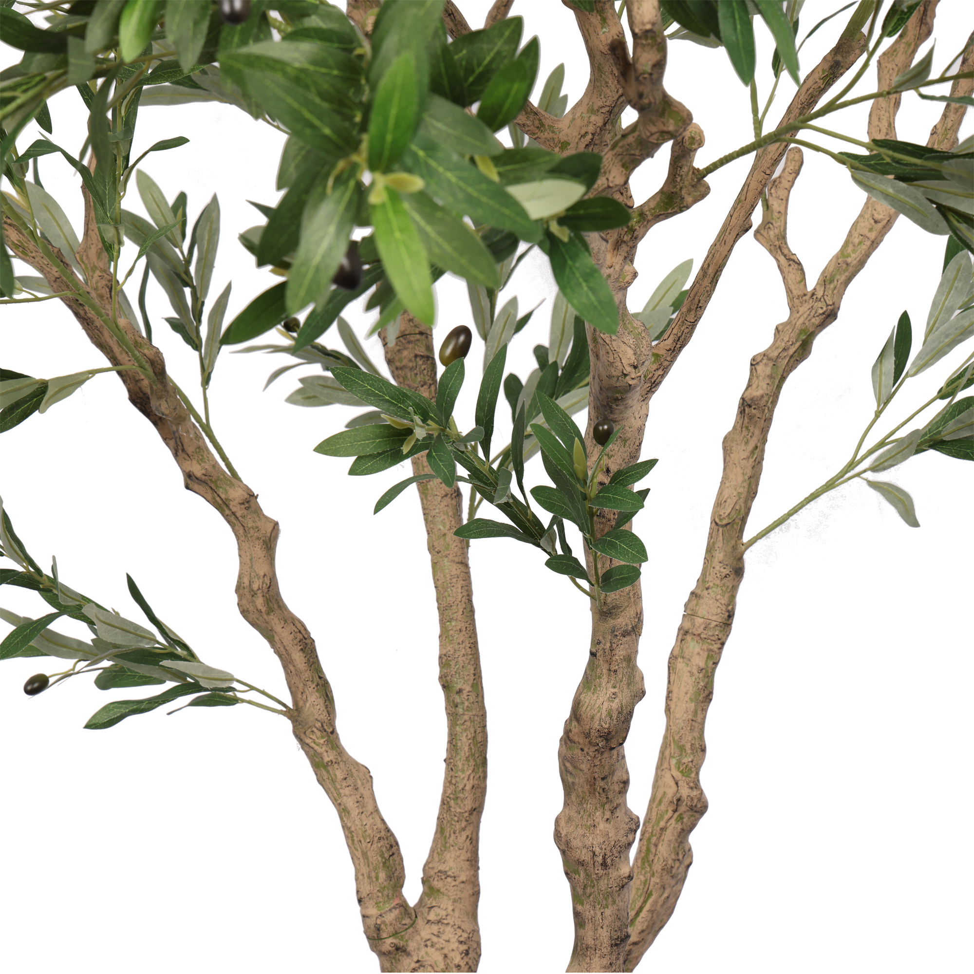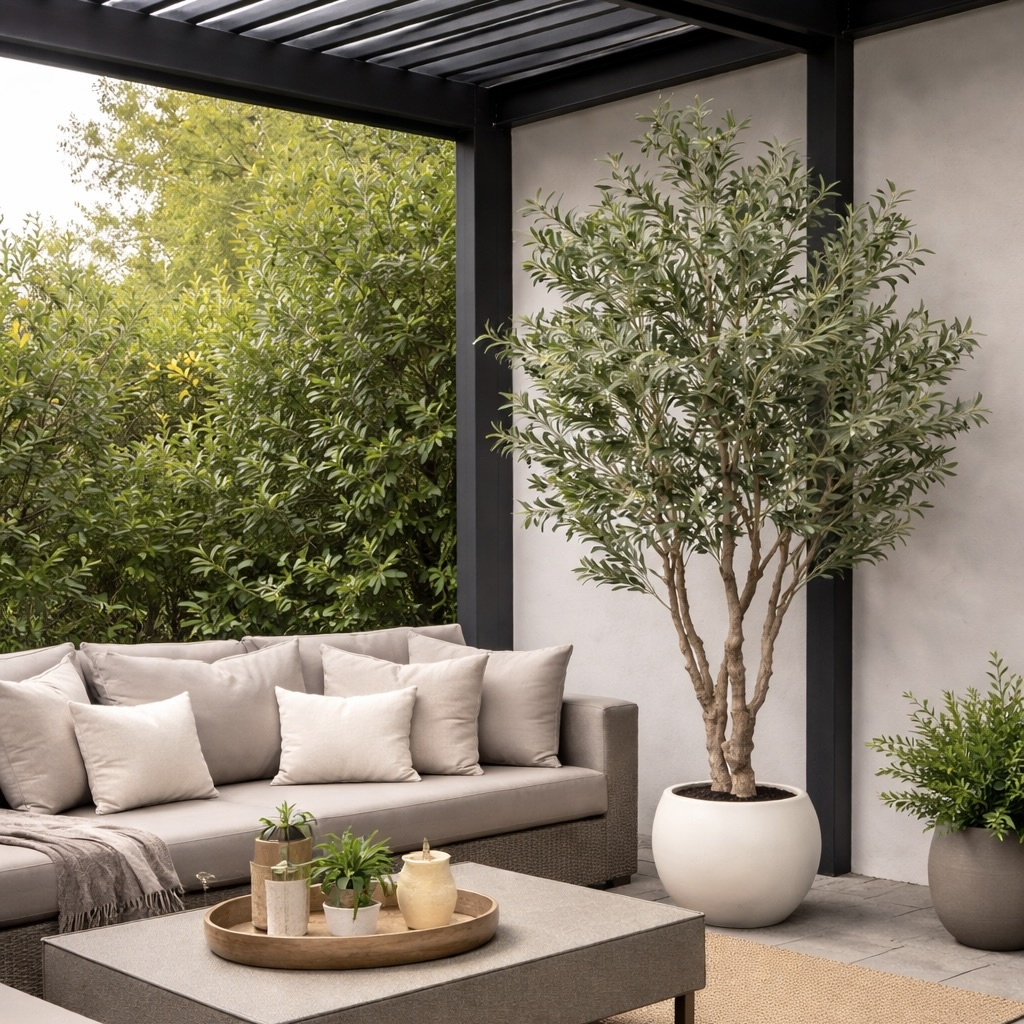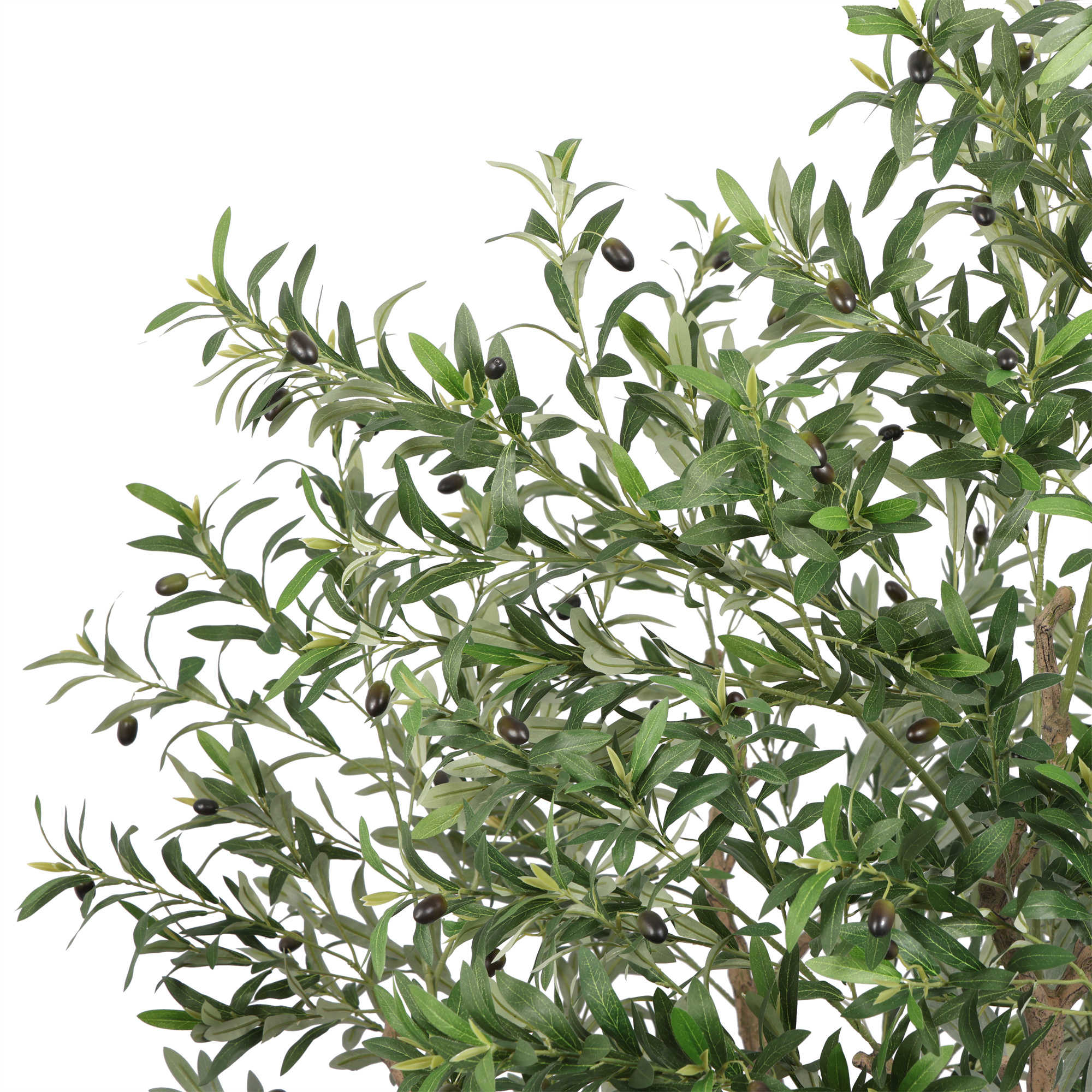 De volle, rijk vertakte kruin met frisgroene, realistisch gevormde bladeren en subtiel verspreide olijven geeft de boom een mediterrane charme en een warme, uitnodigende sfeer. Dankzij zijn elegante vorm en natuurlijke proporties sluit hij naadloos aan bij strakke, eigentijdse buitenruimtes, terwijl hij tegelijkertijd zorgt voor een zachte, groene tegenhanger in het geheel.