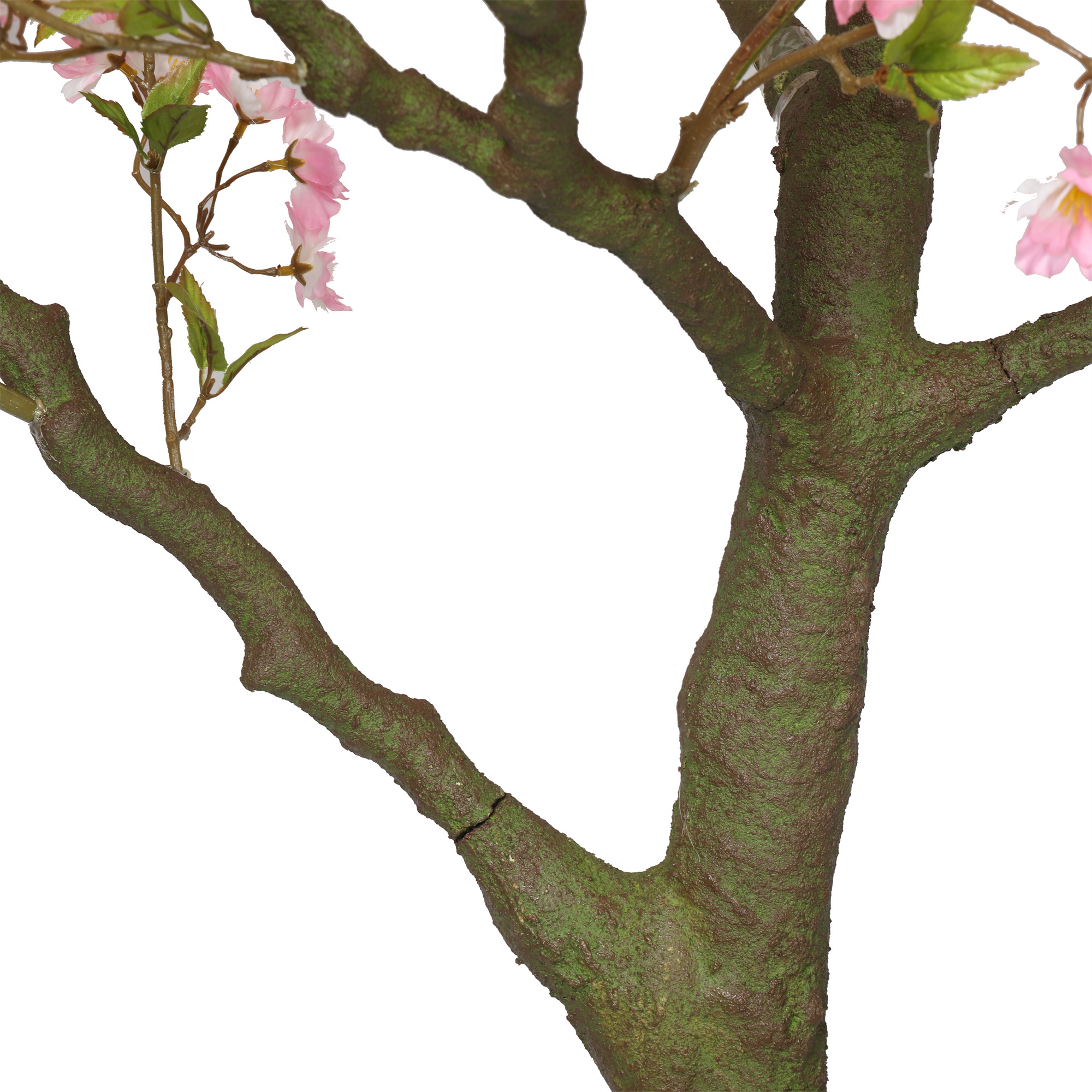 De boom is rijkelijk voorzien van levensechte roze kersenbloesem, die zorgen voor een warme en sfeervolle uitstraling. De extra dikke stam geeft de boom een krachtige, natuurlijke basis en versterkt het realistische karakter.