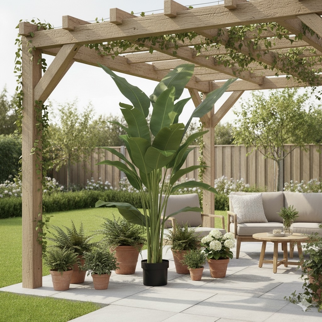 De bananenboom is ontworpen voor gebruik binnenshuis, maar staat ook prachtig buiten onder een afdak of overkapping. Geplaatst naast een loungeset zorgt hij direct voor een ontspannen, zomerse sfeer en een luxe uitstraling.