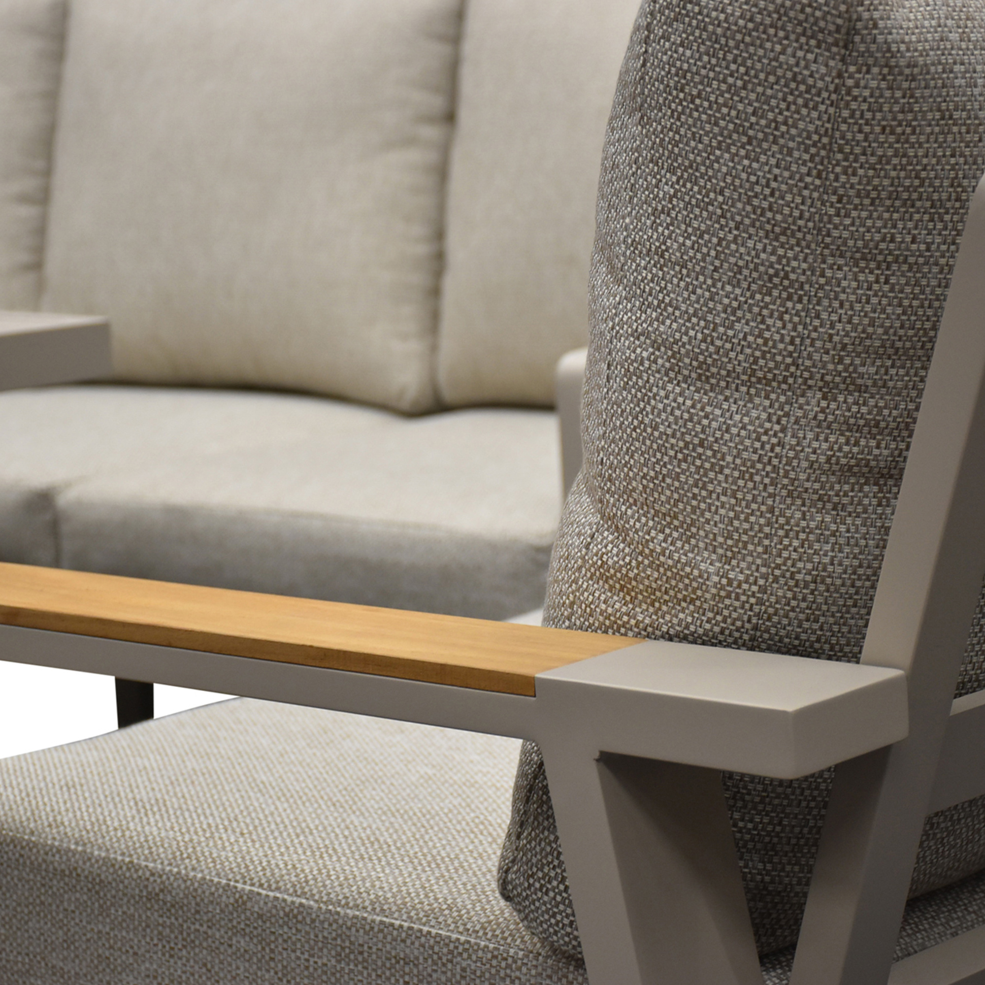 De Lola set is strak vormgegeven en afgewerkt met elegante teak inleg in de armleuningen. Het onderstel van gepoedercoat aluminium maakt de set sterk, licht én volledig weerbestendig. Dat betekent: zonder zorgen buiten laten staan, seizoen na seizoen. Het teak zal op natuurlijke wijze prachtig vergrijzen – een look waar veel liefhebbers juist voor kiezen. Liever de originele kleur behouden? Met een wood protector houd je het teak eenvoudig in topconditie.