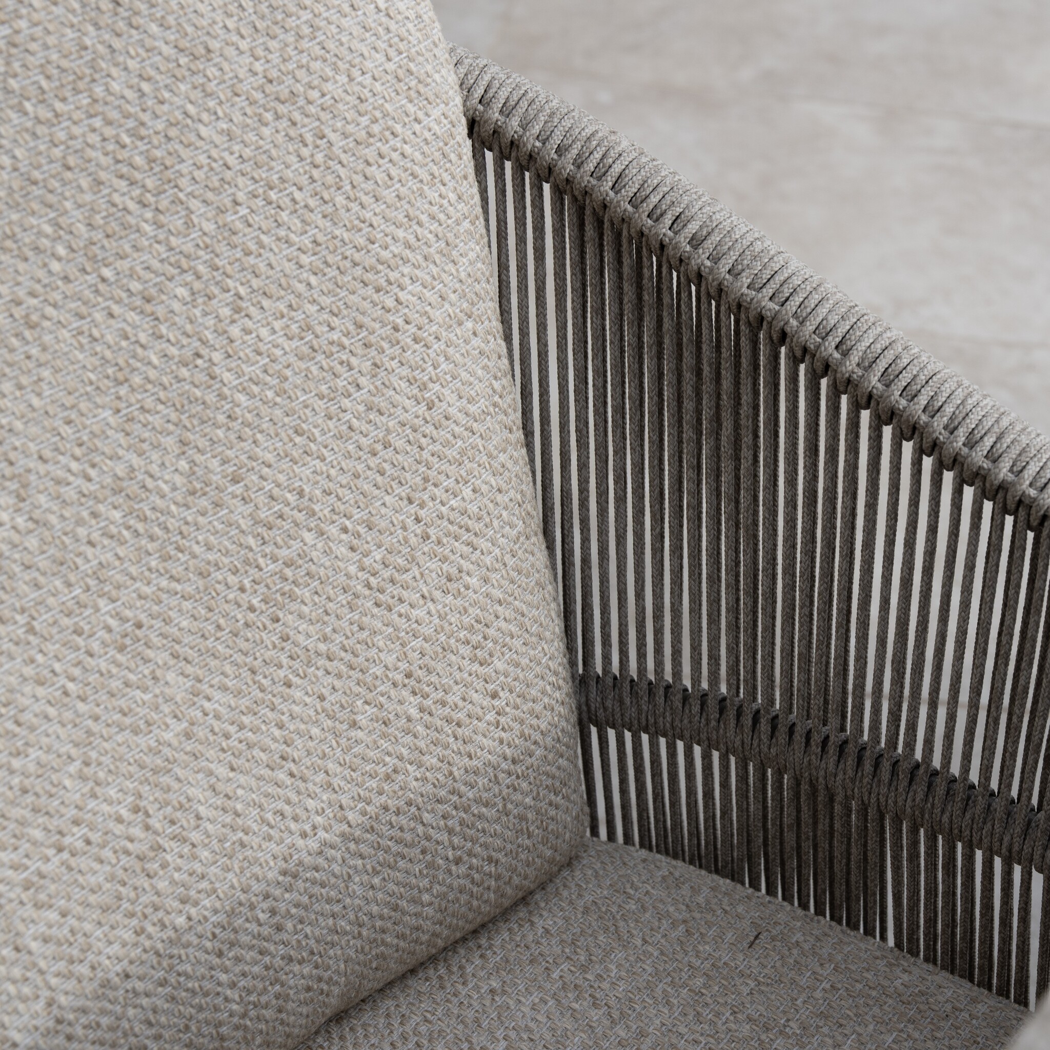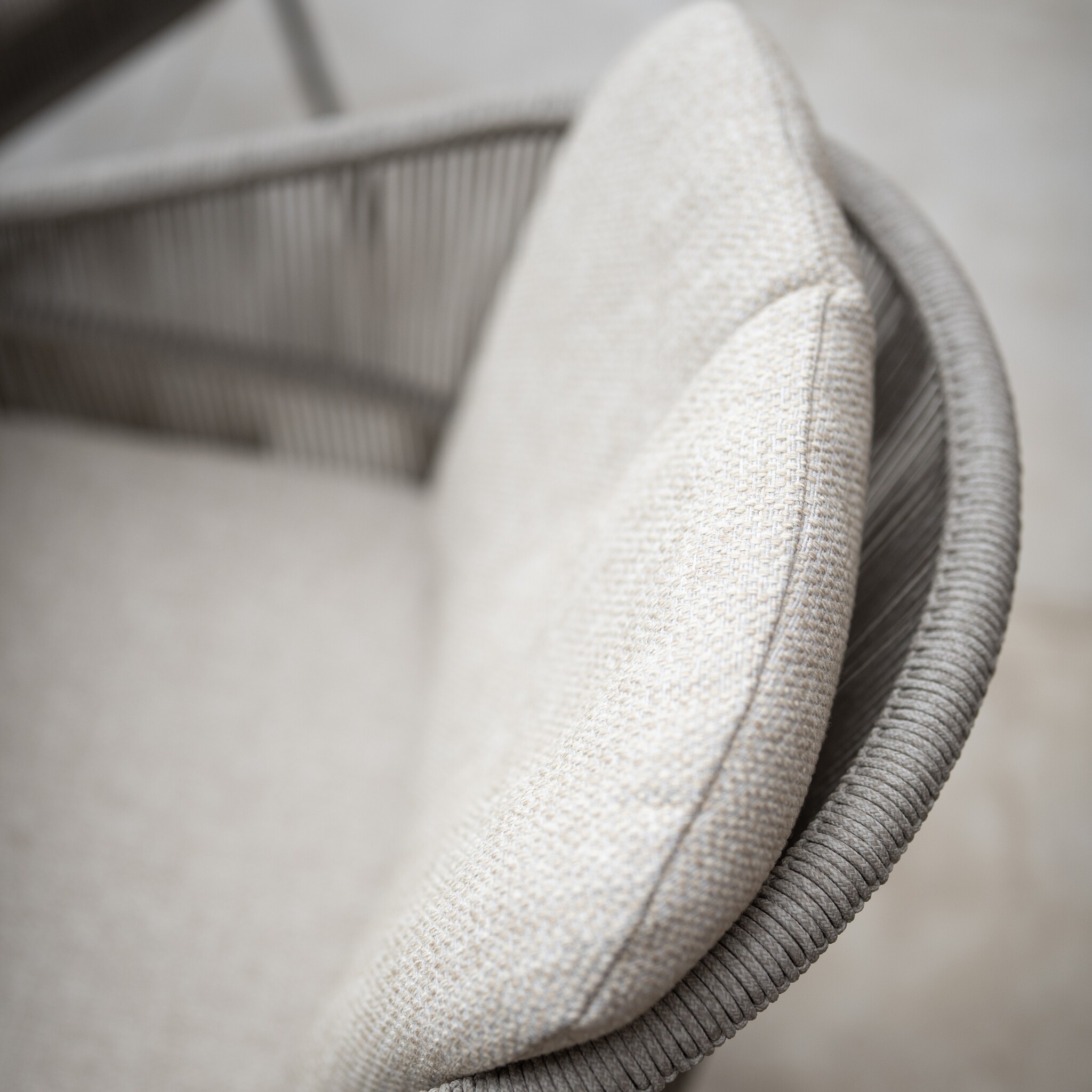 Voor een optimaal zitcomfort is de Florence uitgerust met luxe all-weather kussens in een zachte, neutrale kleur die perfect aansluit bij het lichte rope. Deze kussens zijn voorzien van een comfortabele vulling en een afneembare, water- en vuilafstotende olefin stof. Hierdoor geniet je niet alleen van een heerlijke zitervaring, maar is onderhoud ook eenvoudig.