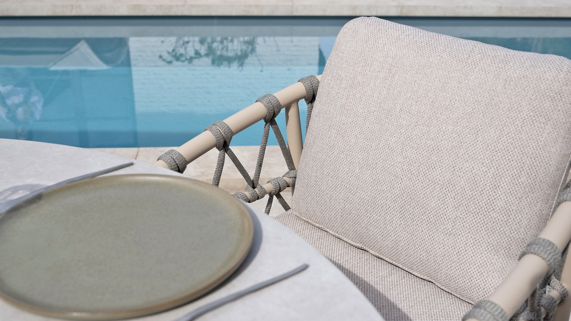 Het frame is gemaakt van duurzaam gepoedercoat aluminium in de warme kleur Latte, wat zorgt voor een elegante, weerbestendige basis. De rugleuning en armleuningen zijn afgewerkt met hoogwaardig rope in de kleur grijs, dat niet alleen een eigentijdse uitstraling geeft, maar ook zorgt voor extra comfort en flexibiliteit.
