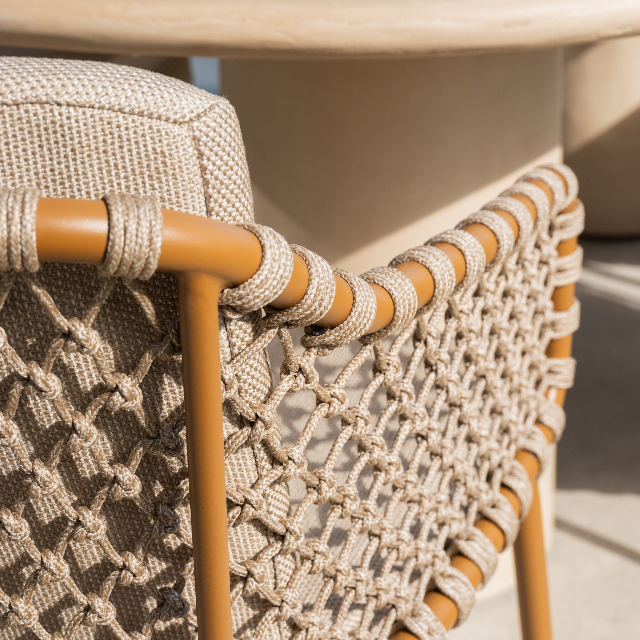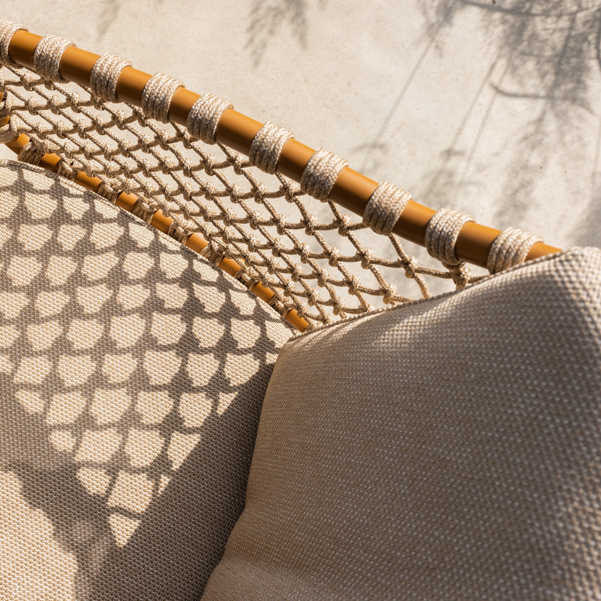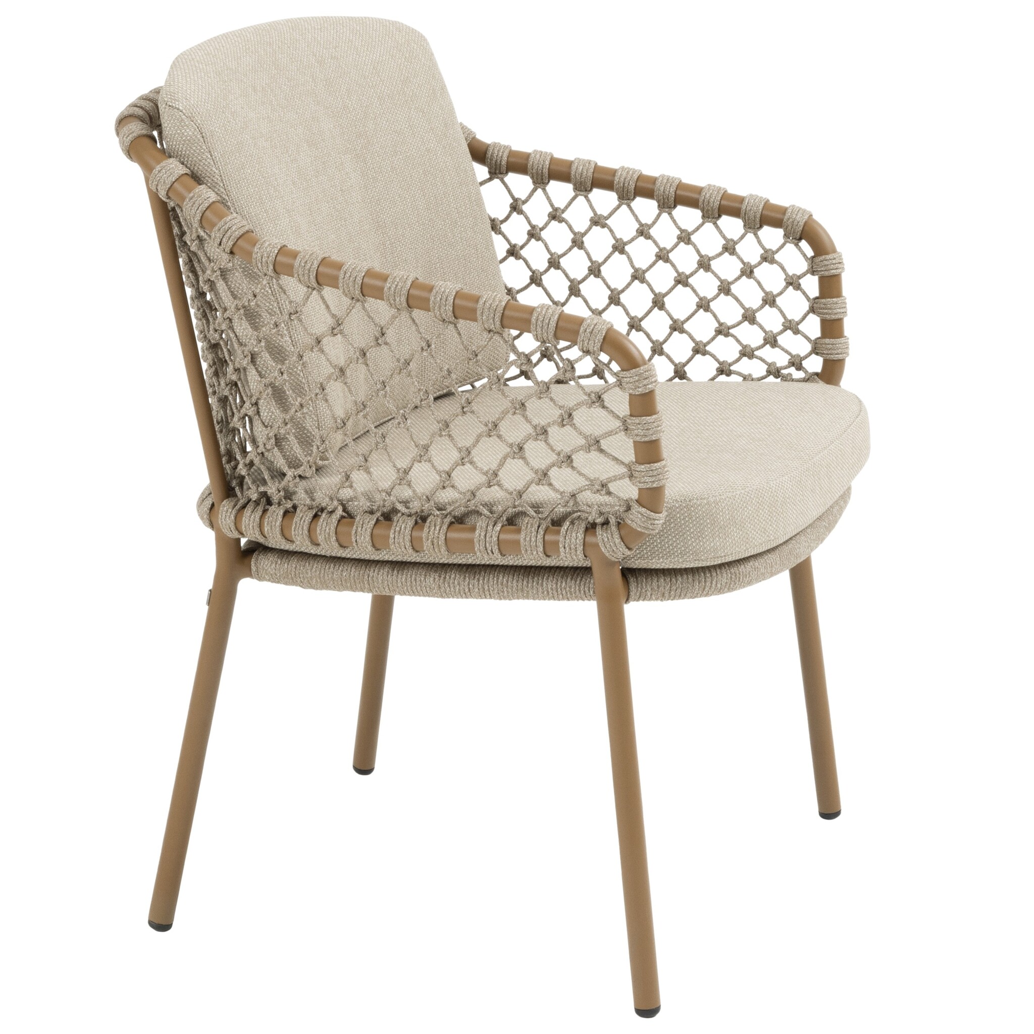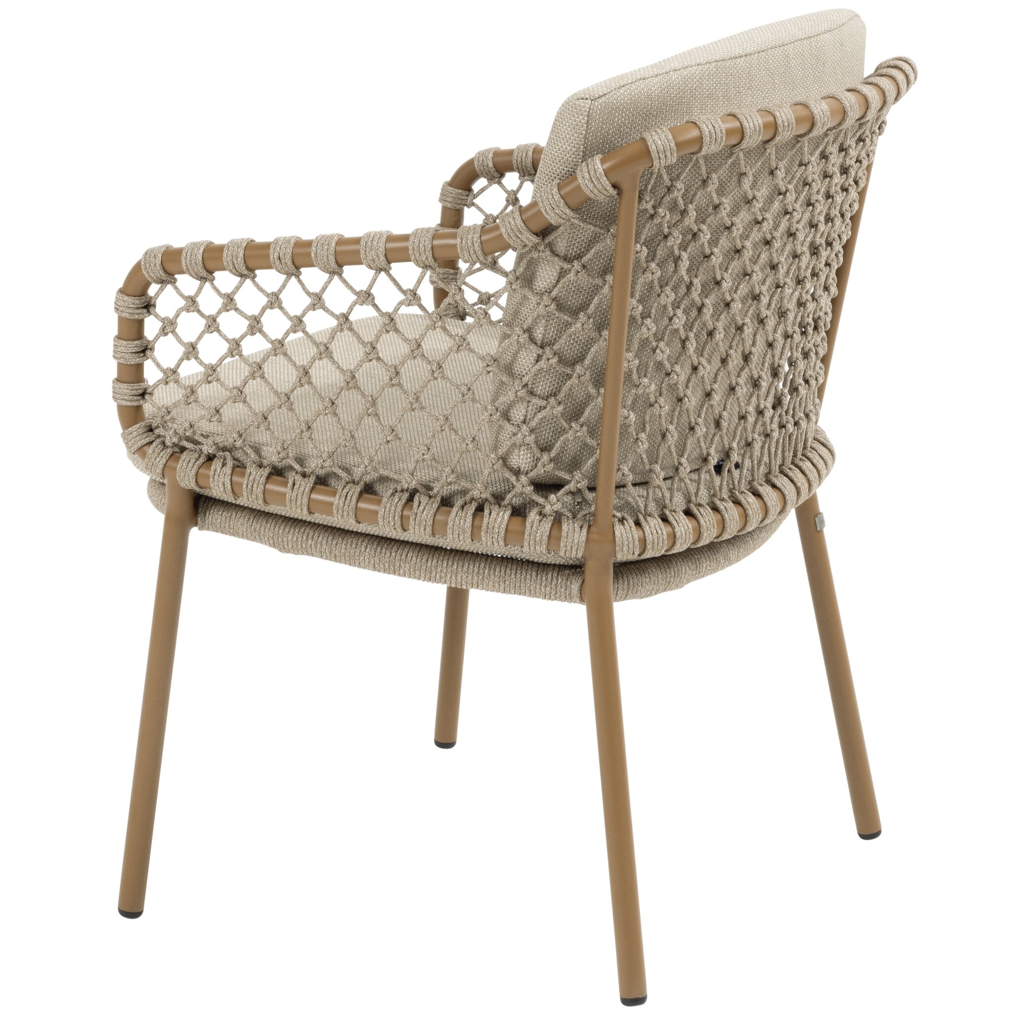 De rugleuning en armleuningen zijn prachtig afgewerkt met met de hand gevlochten rope in de kleur zand. Dit open vlechtwerk zorgt voor een luchtige, eigentijdse look en geeft de stoel een speels karakter.