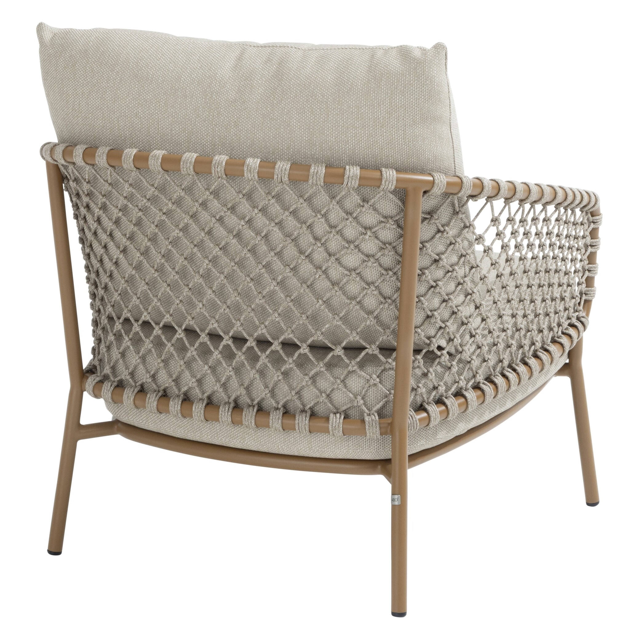 De rug- en armleuningen zijn verfijnd afgewerkt met met de hand gevlochten rope in de kleur zand, wat de stoel een eigentijdse en luchtige uitstraling geeft. Dit vlechtwerk zorgt niet alleen voor een moderne look, maar ook voor extra zitcomfort.