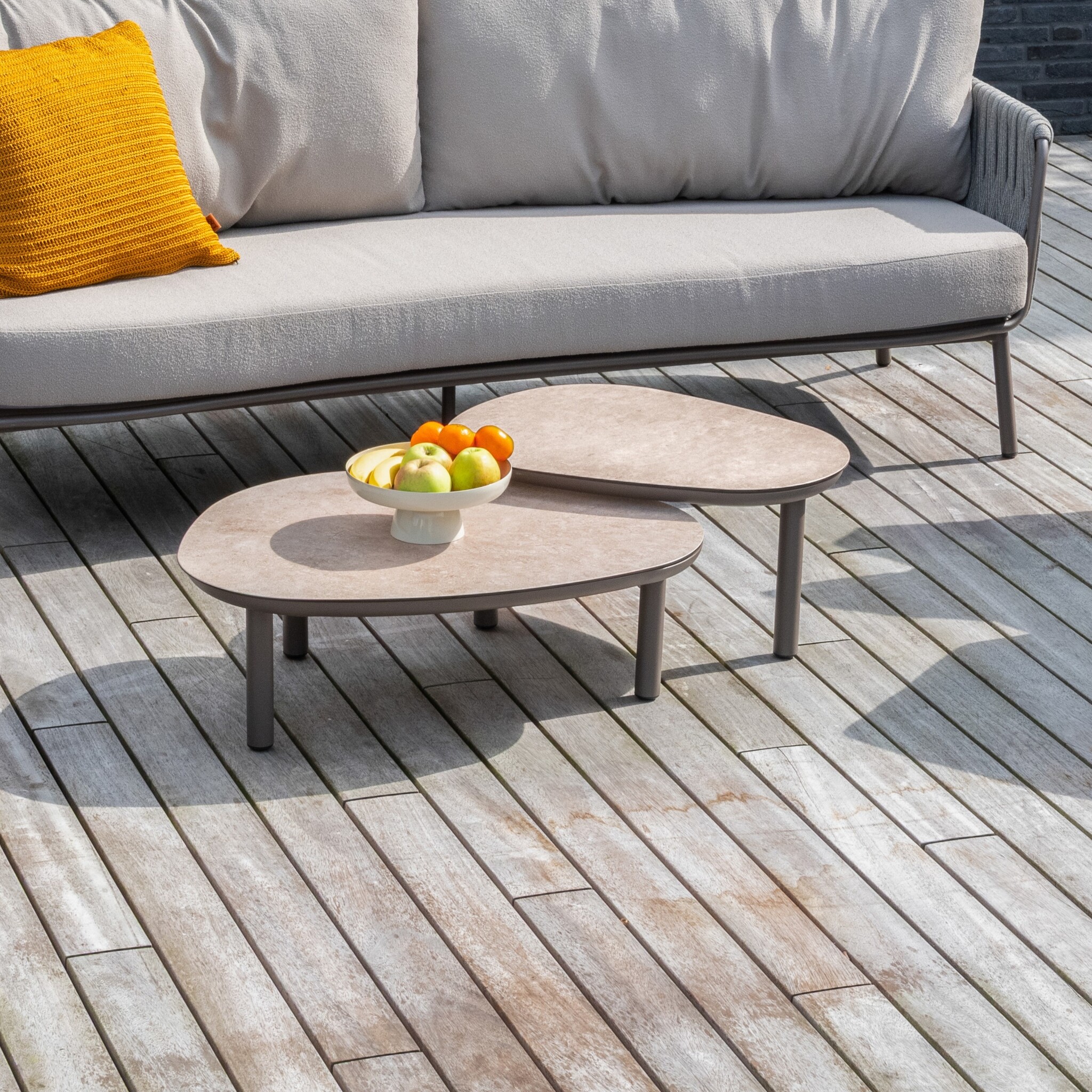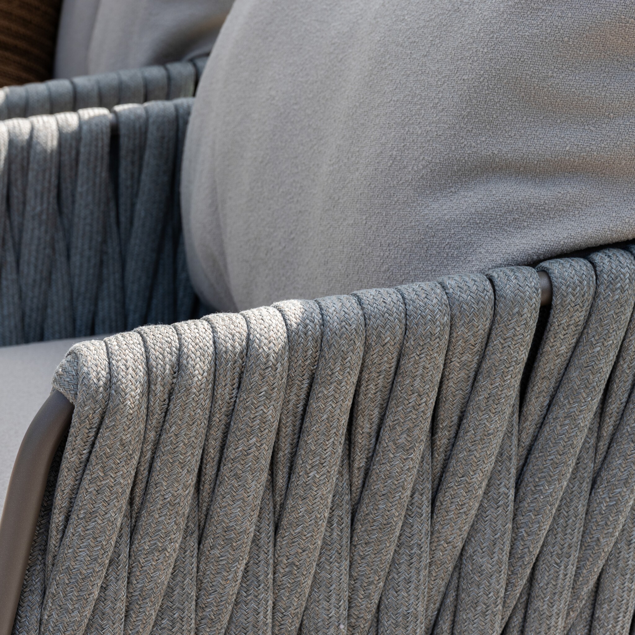 De Cannes loungeset kenmerkt zich door haar moderne, zachte vormen en luxueuze materiaalgebruik. Het frame is gemaakt van gepoedercoat aluminium in de kleur terre, een warme, taupeachtige tint die perfect past binnen iedere buitenomgeving. De rug- en armleuningen zijn met de hand afgewerkt met een prachtig gevlochten rope in grijs, wat zorgt voor een subtiel spel van textuur en diepte.