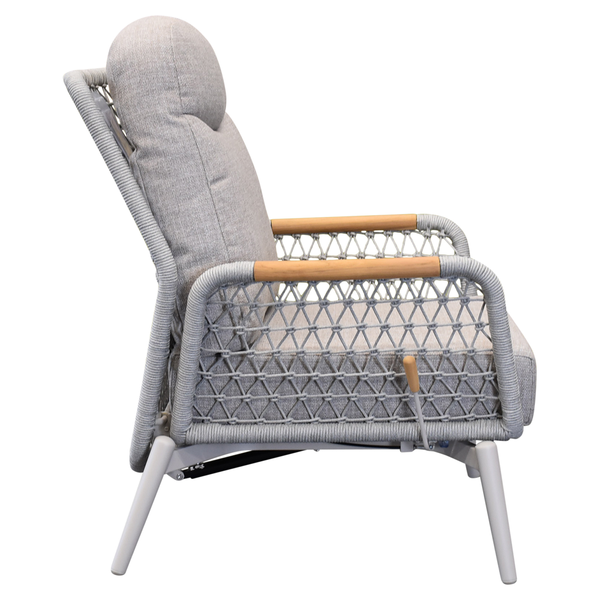 De teak houten armleuningen geven de stoel een luxe, warme touch en vormen een mooi contrast met het moderne rope en aluminium. Dankzij de organische vormen is de Monza loungestoel helemaal van nu en past hij perfect in zowel strakke als natuurlijke tuininrichtingen.