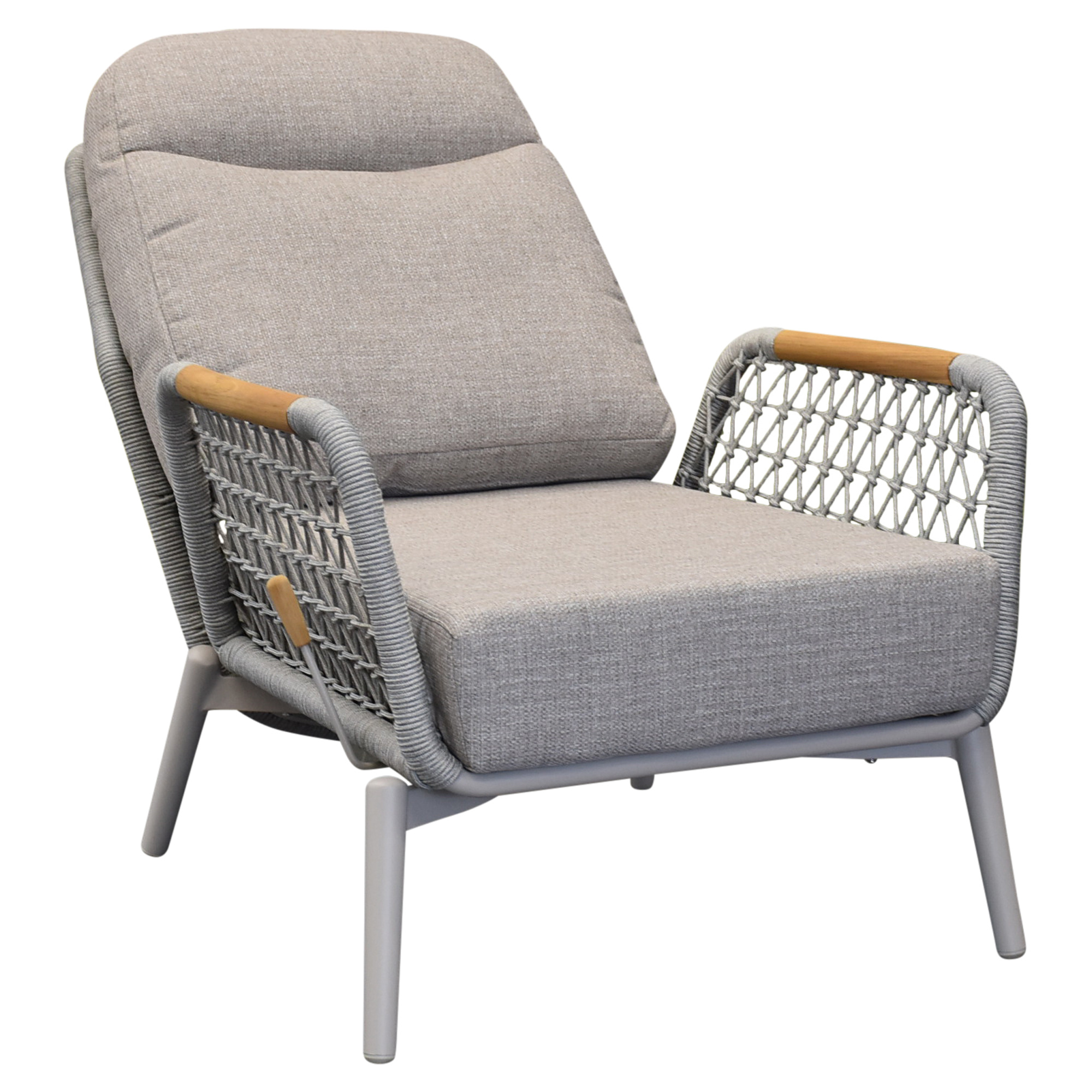 De teak houten armleuningen geven de stoel een luxe, warme touch en vormen een mooi contrast met het moderne rope en aluminium. Dankzij de organische vormen is de Monza loungestoel helemaal van nu en past hij perfect in zowel strakke als natuurlijke tuininrichtingen.