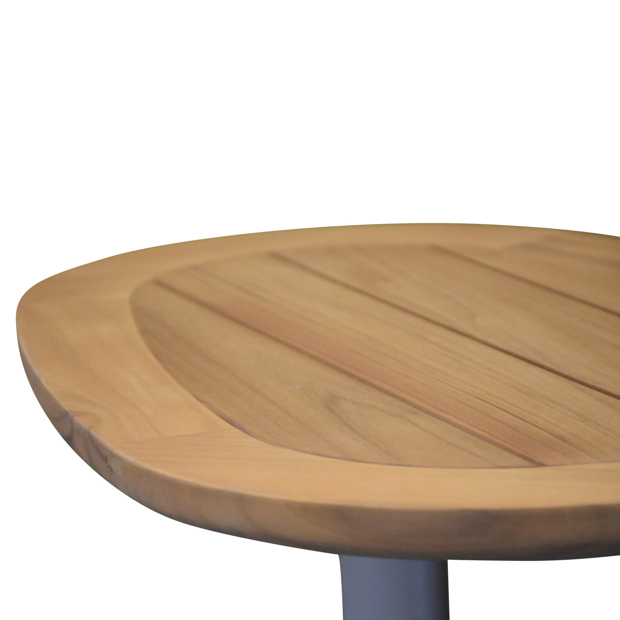 Het frame van de tafel is gemaakt van gepoedercoat aluminium in de kleur latte, het tafel blad is gemaakt van teakhout.