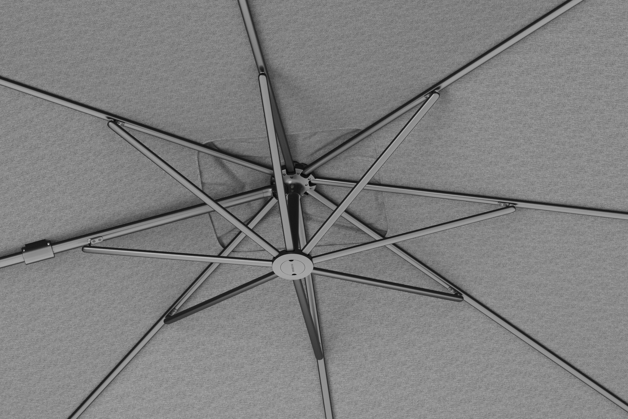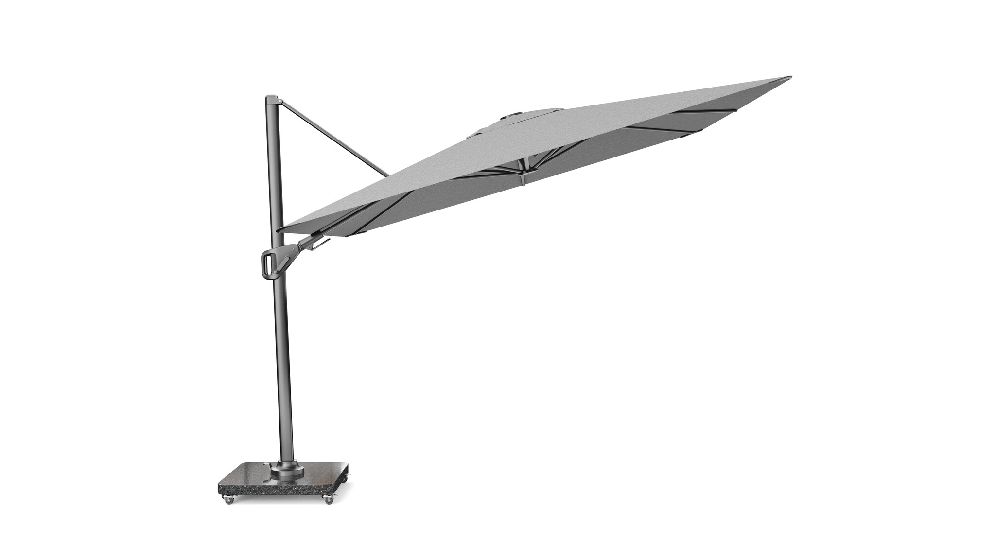 Platinum Sun & Shade zweefparasol Nexus T² Premium 300×300 Manhattan. De ronde hoeken, de minimalistische verbindingen van de baleinen, de achterwaartse en zijwaartse kantelbaarheid, een 360° draaivoet. Wij leveren de set met een 90kg voet en hoes.
