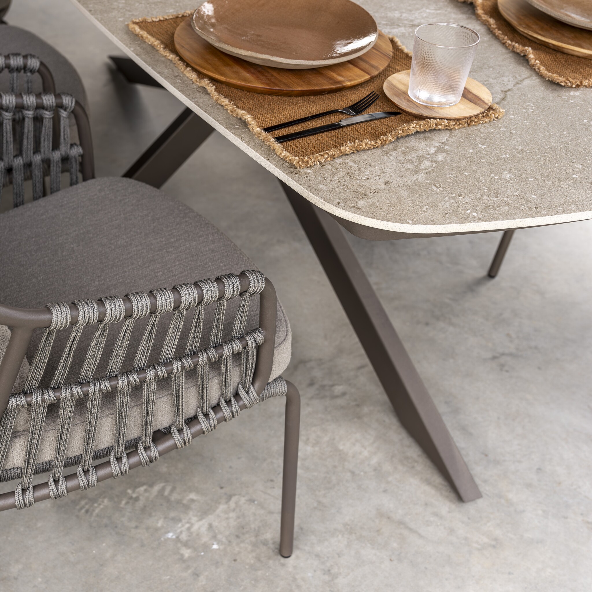 Het elegante onderstel is gemaakt van RVS en afgewerkt met een terre-kleurige poedercoating. Deze warme, aardachtige tint geeft de tafel een eigentijdse en natuurlijke uitstraling die perfect past bij uiteenlopende tuin- en terrasstijlen. Het kruispootontwerp zorgt niet alleen voor een moderne look, maar biedt ook optimale stabiliteit en veel beenruimte, waardoor je met meerdere stoelen comfortabel kunt aanschuiven.