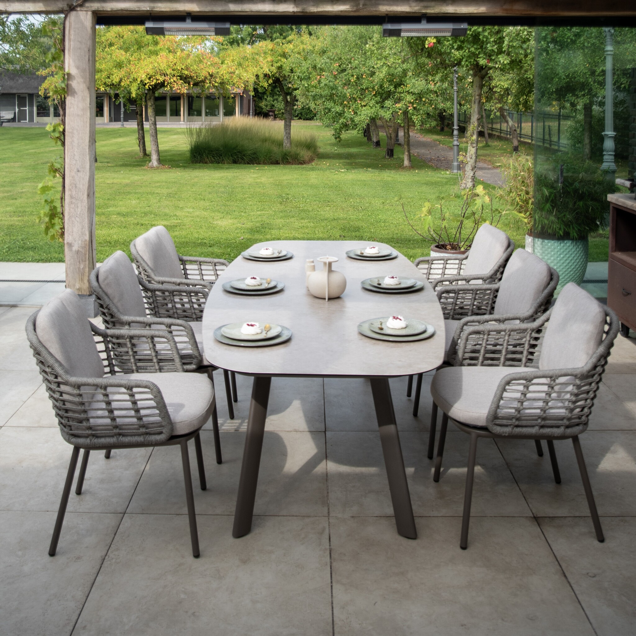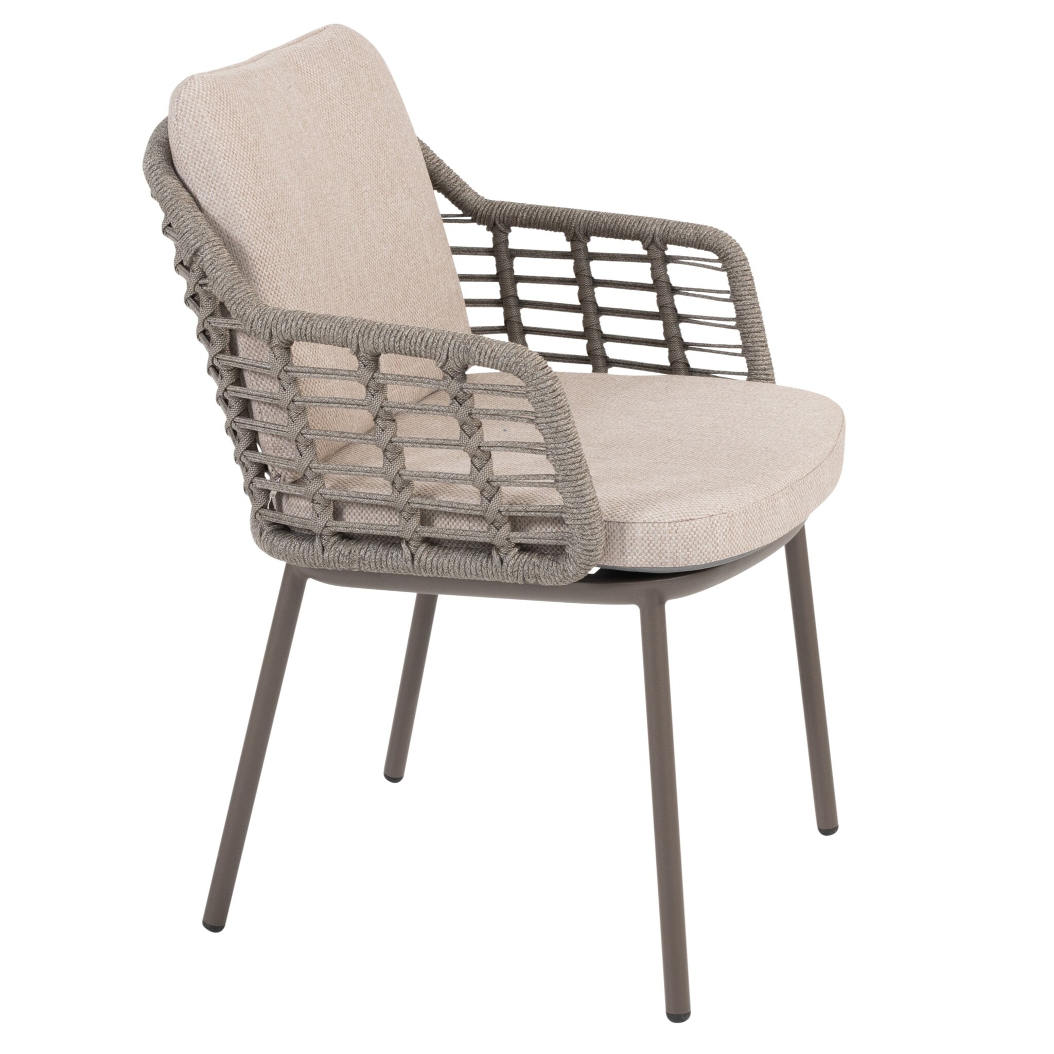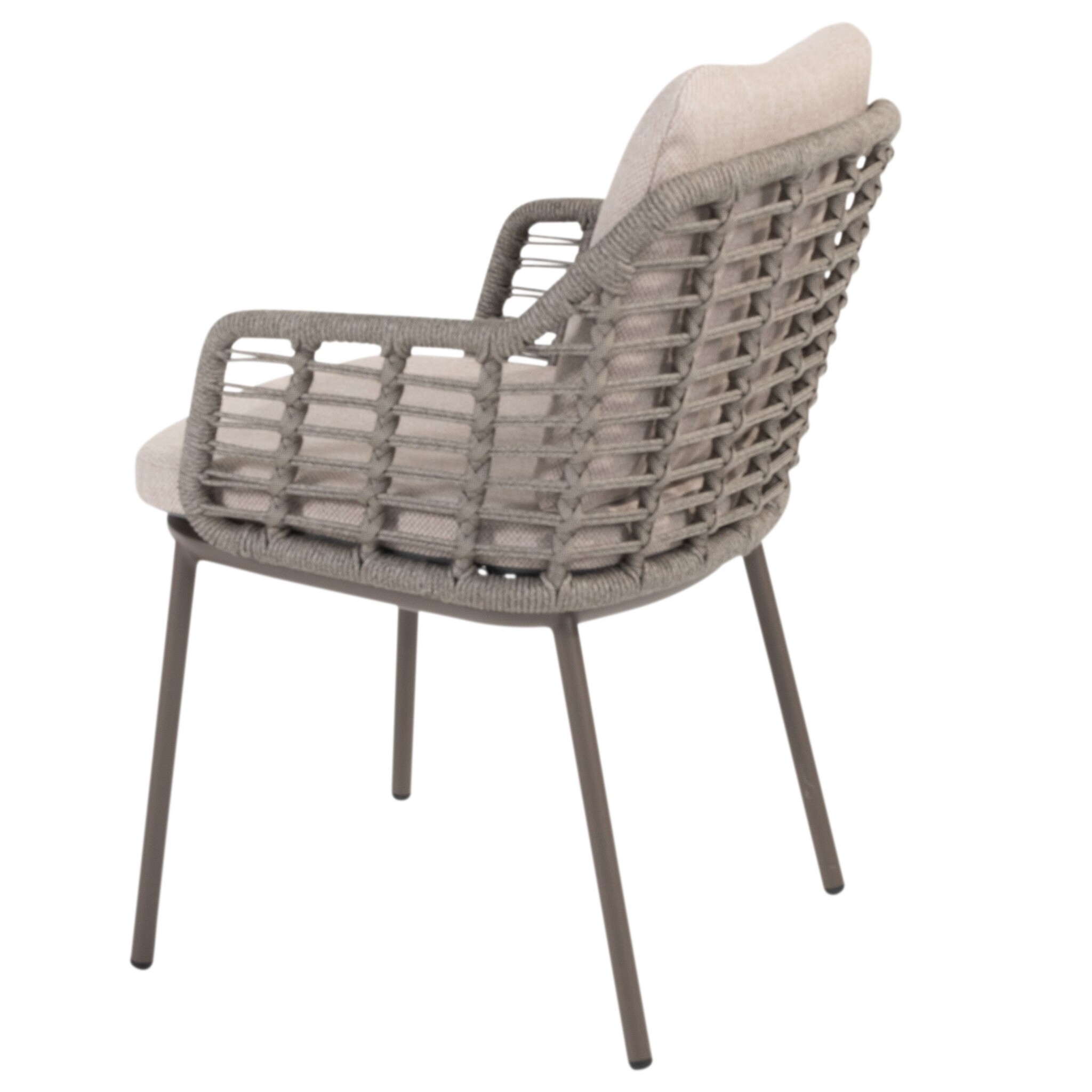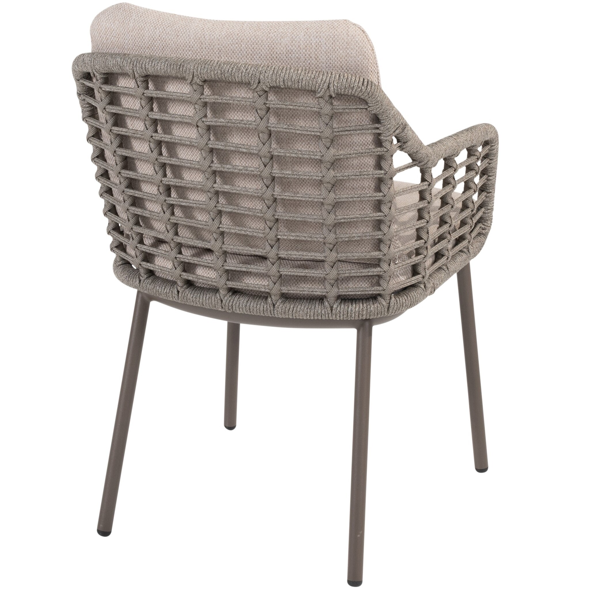 De rugleuning en armleuningen zijn met de hand afgewerkt met hoogwaardig rope in de kleur grijs. Dit gevlochten touw zorgt niet alleen voor een stijlvolle, luchtige uitstraling, maar biedt ook een heerlijk comfort dankzij de lichte vering. De open geweven structuur geeft de stoel een moderne, ambachtelijke look en zorgt voor optimale ventilatie op warme dagen.