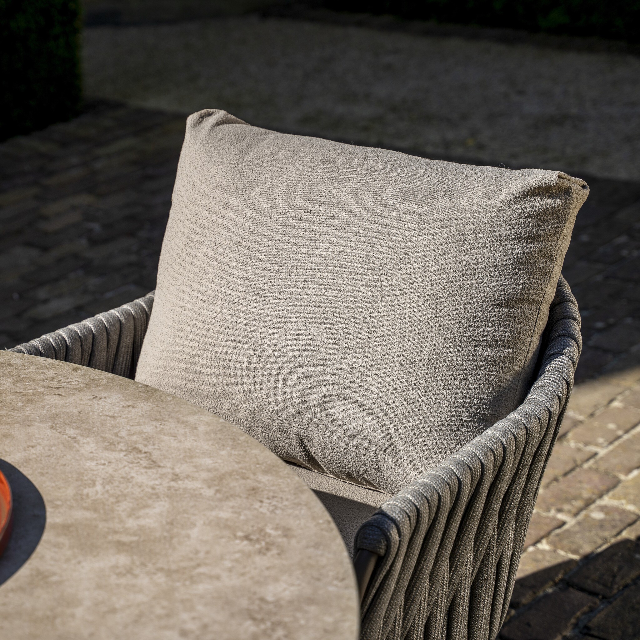 De Cannes low dining stoel onderscheidt zich door zijn verfijnde vormgeving en harmonieuze materiaalcombinatie. Het stevige frame is gemaakt van gepoedercoat aluminium in de kleur terre, een elegante taupe-tint die warmte en rust uitstraalt. Rondom de rugleuning en armleuningen is de stoel met de hand afgewerkt met een brede, luxe rope in grijs, wat zorgt voor een verfijnd, ambachtelijk karakter.