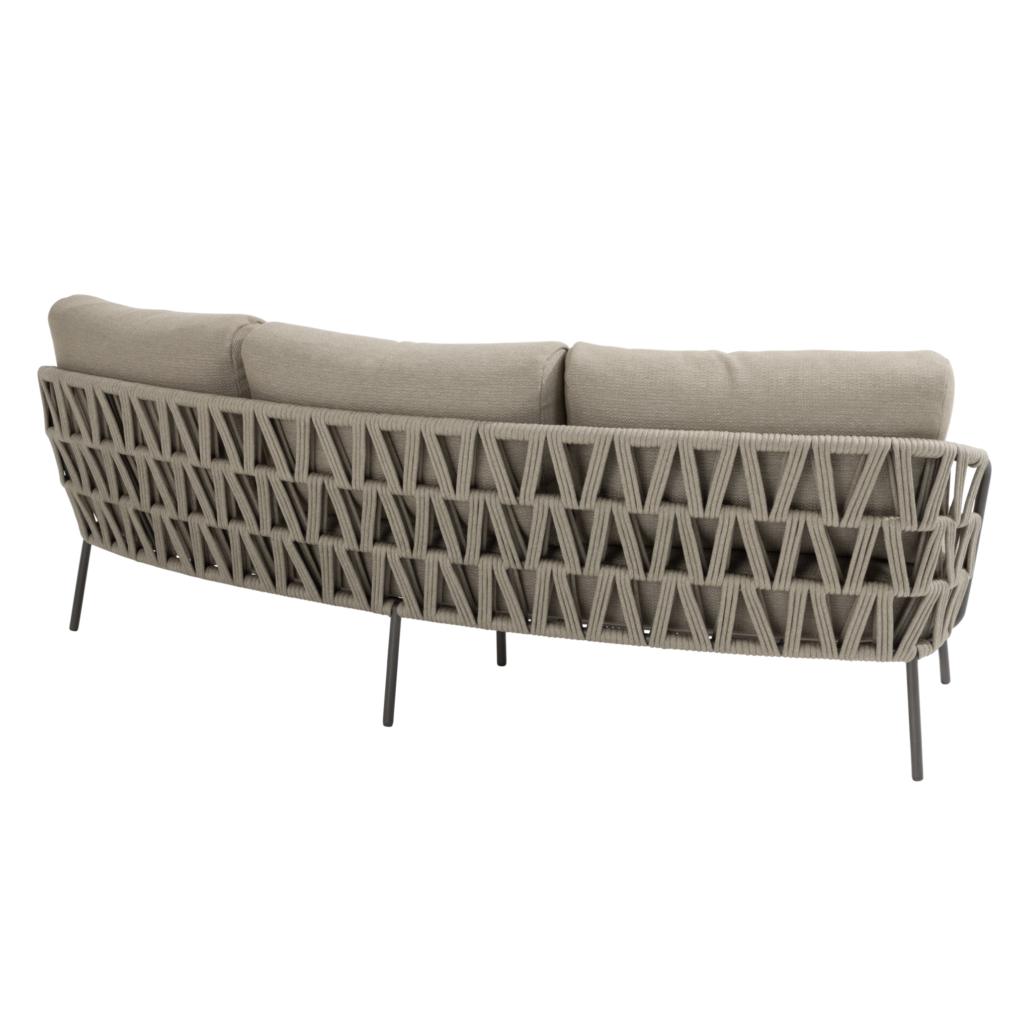 Het frame is gemaakt van gepoedercoat aluminium, waardoor de bank stevig, licht van gewicht en weerbestendig is. De rugleuning en zijkanten zijn stijlvol afgewerkt met met de hand gevlochten rope, wat een eigentijdse en luchtige uitstraling geeft.