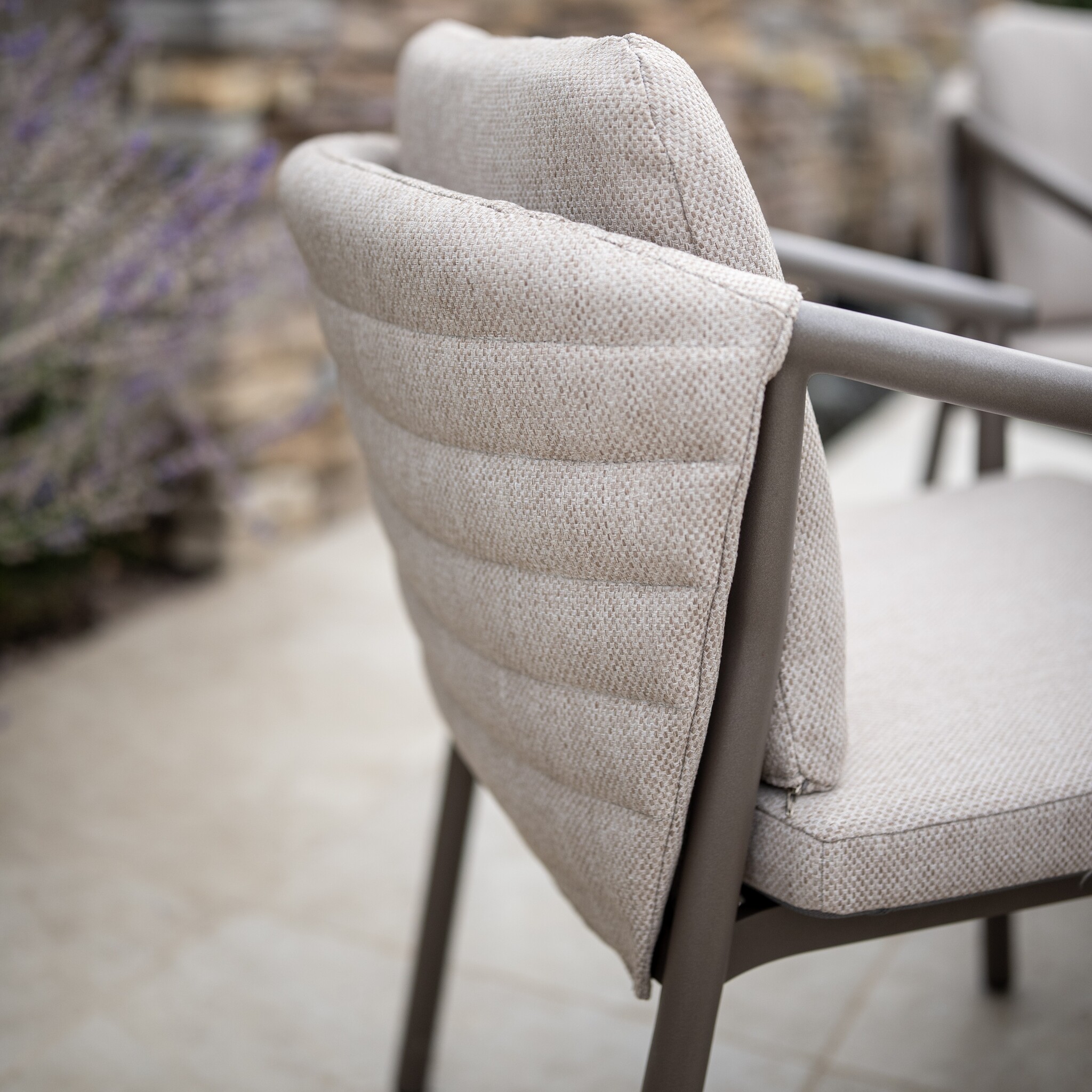 De stoel wordt geleverd met een comfortabel zit- en rugkussen in een neutrale, zachte kleur. De kussens zijn voorzien van een all weather vulling voor extra comfort en voorzien van een sterke, weerbestendige olefin stof die bestand is tegen een regenbui en snel droogt. Dankzij de ergonomische vormgeving en zachte kussens kun je met de Barolo urenlang ontspannen tafelen.