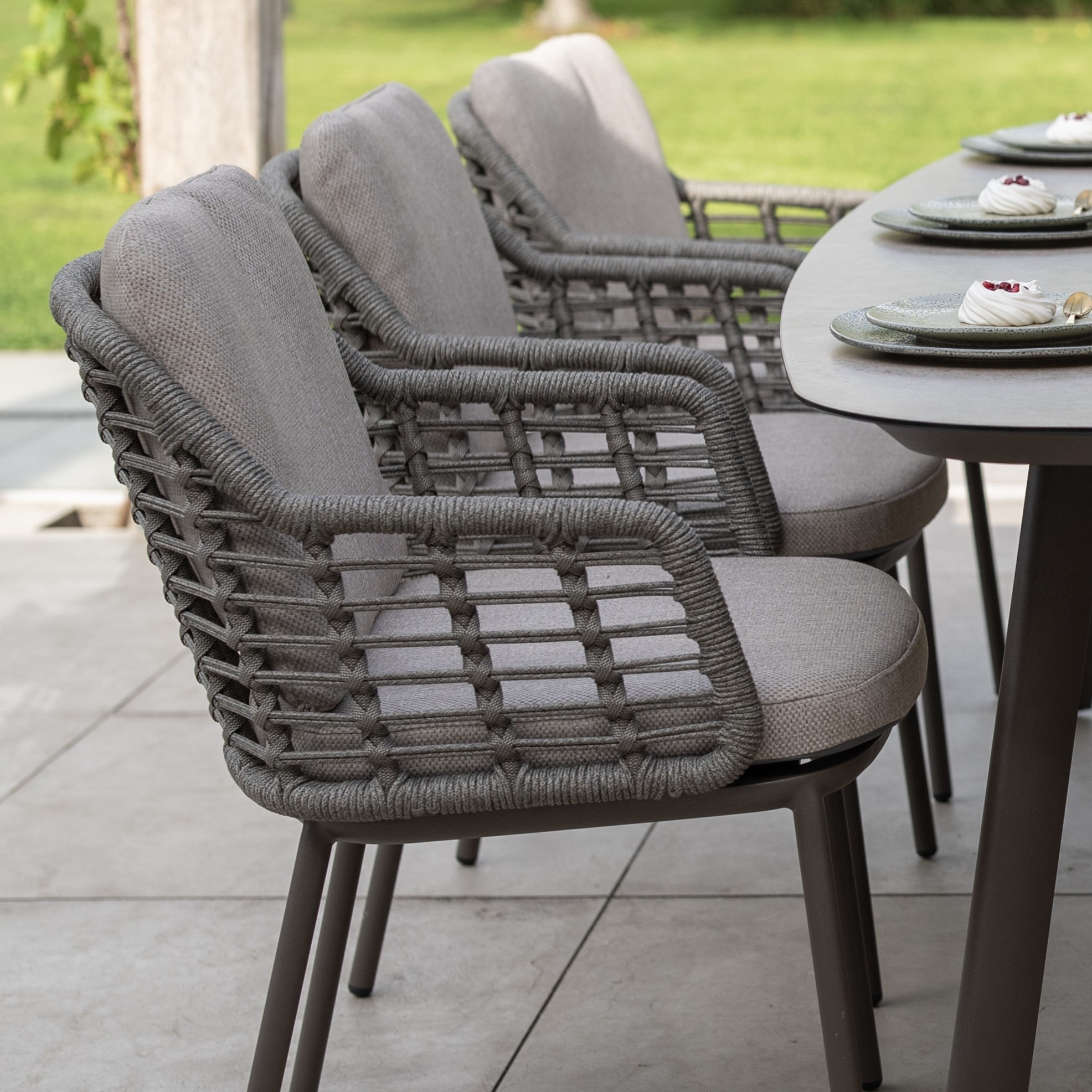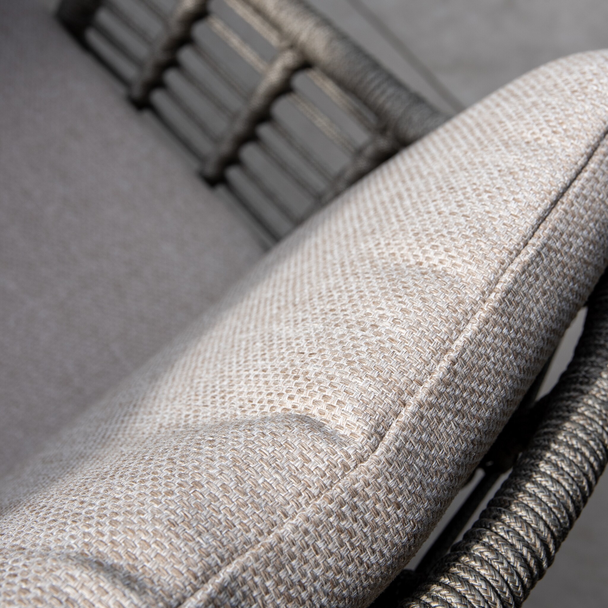 De rugleuning en armleuningen zijn met de hand afgewerkt met hoogwaardig rope in de kleur grijs. Dit gevlochten touw zorgt niet alleen voor een stijlvolle, luchtige uitstraling, maar biedt ook een heerlijk comfort dankzij de lichte vering. De open geweven structuur geeft de stoel een moderne, ambachtelijke look en zorgt voor optimale ventilatie op warme dagen.