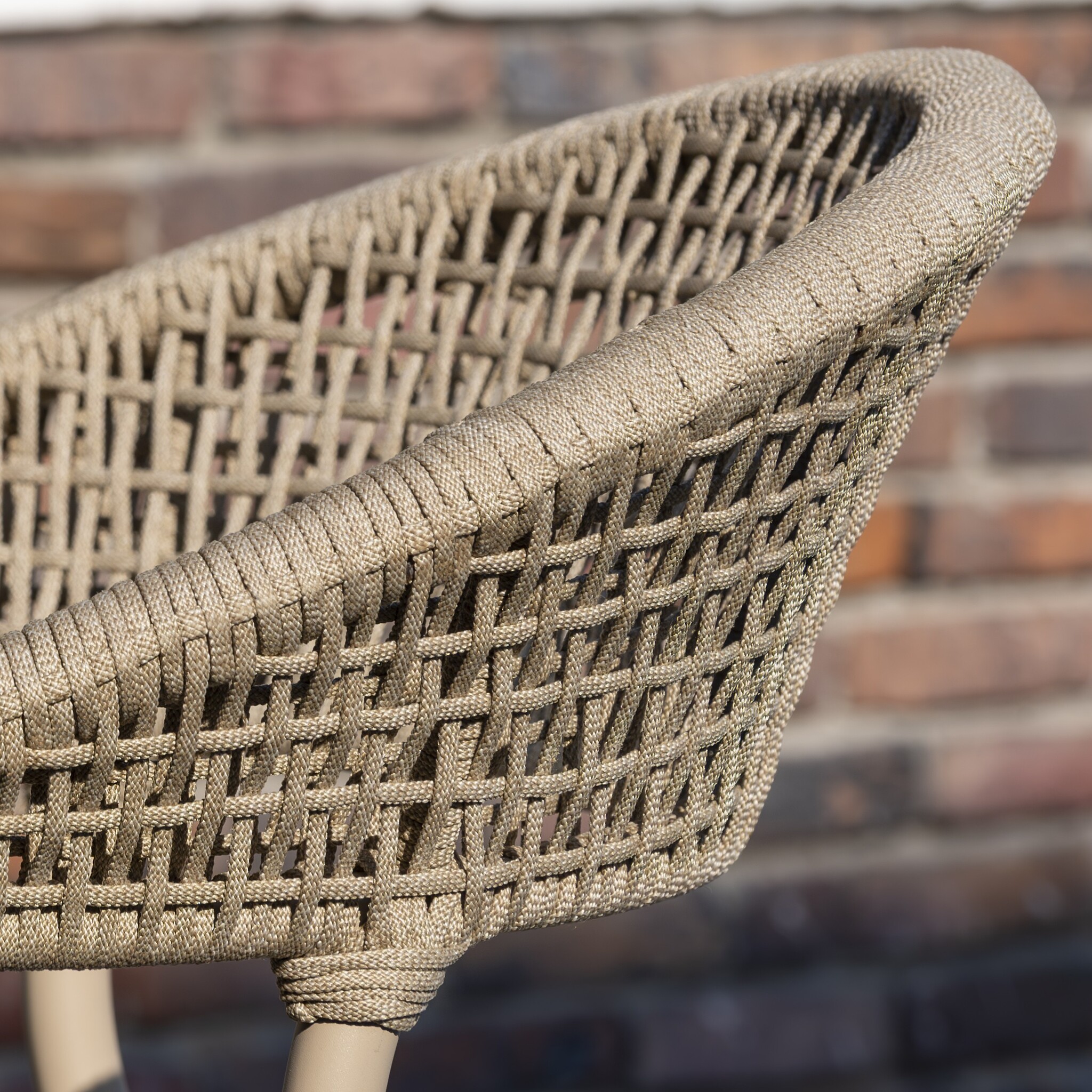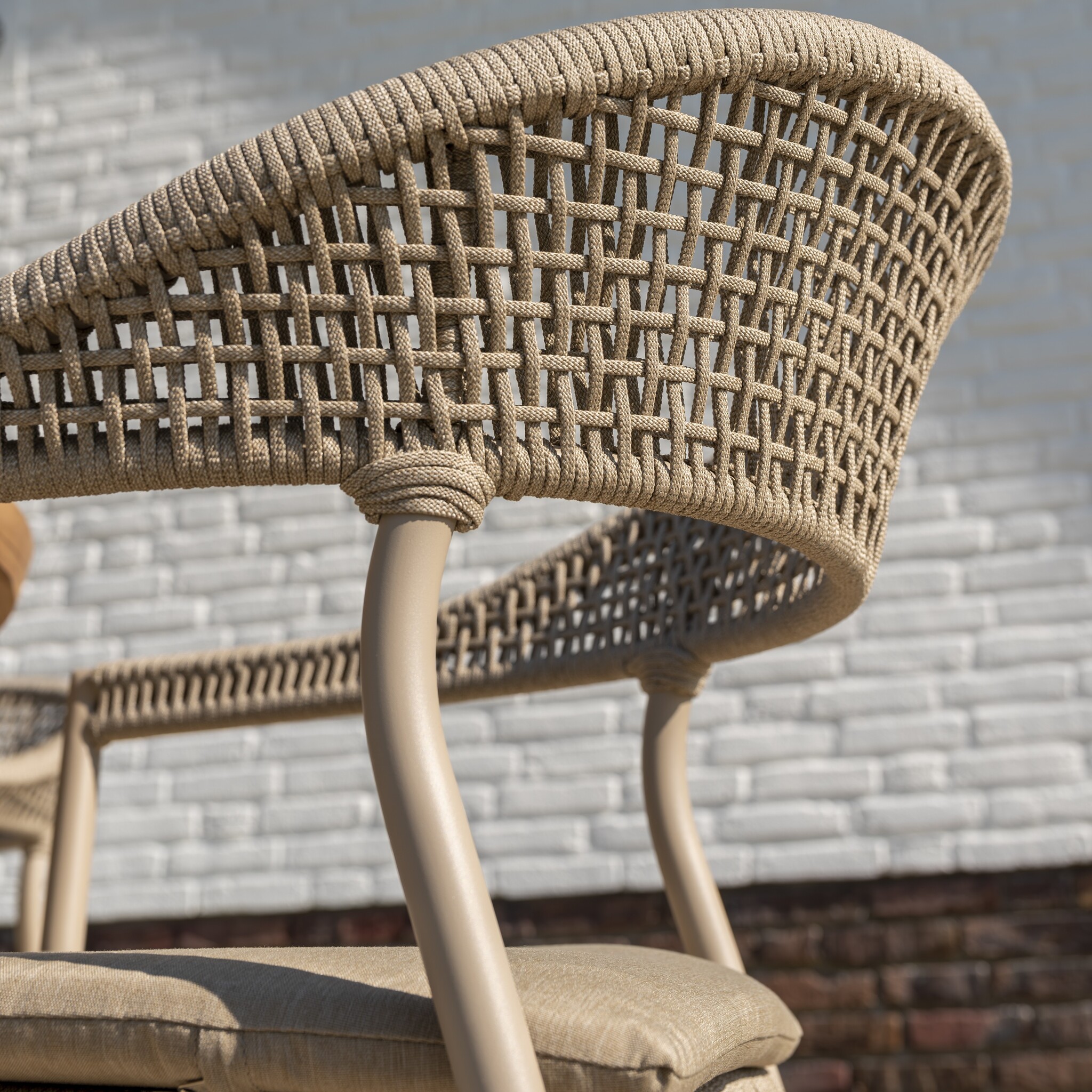 Het frame is gemaakt van gepoedercoat aluminium in de stijlvolle kleur latte. Dit maakt de stoel niet alleen licht van gewicht, maar ook weerbestendig en onderhoudsarm. De rugleuning en armleuningen zijn met de hand afgewerkt met duurzaam rope, wat zorgt voor een natuurlijke, warme uitstraling en een prettig zitcomfort.