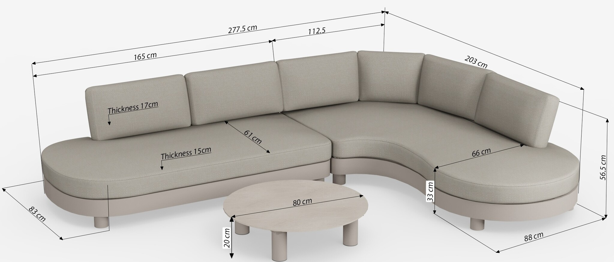 De afmeting van de hoekopstelling is 278x203xH60 cm