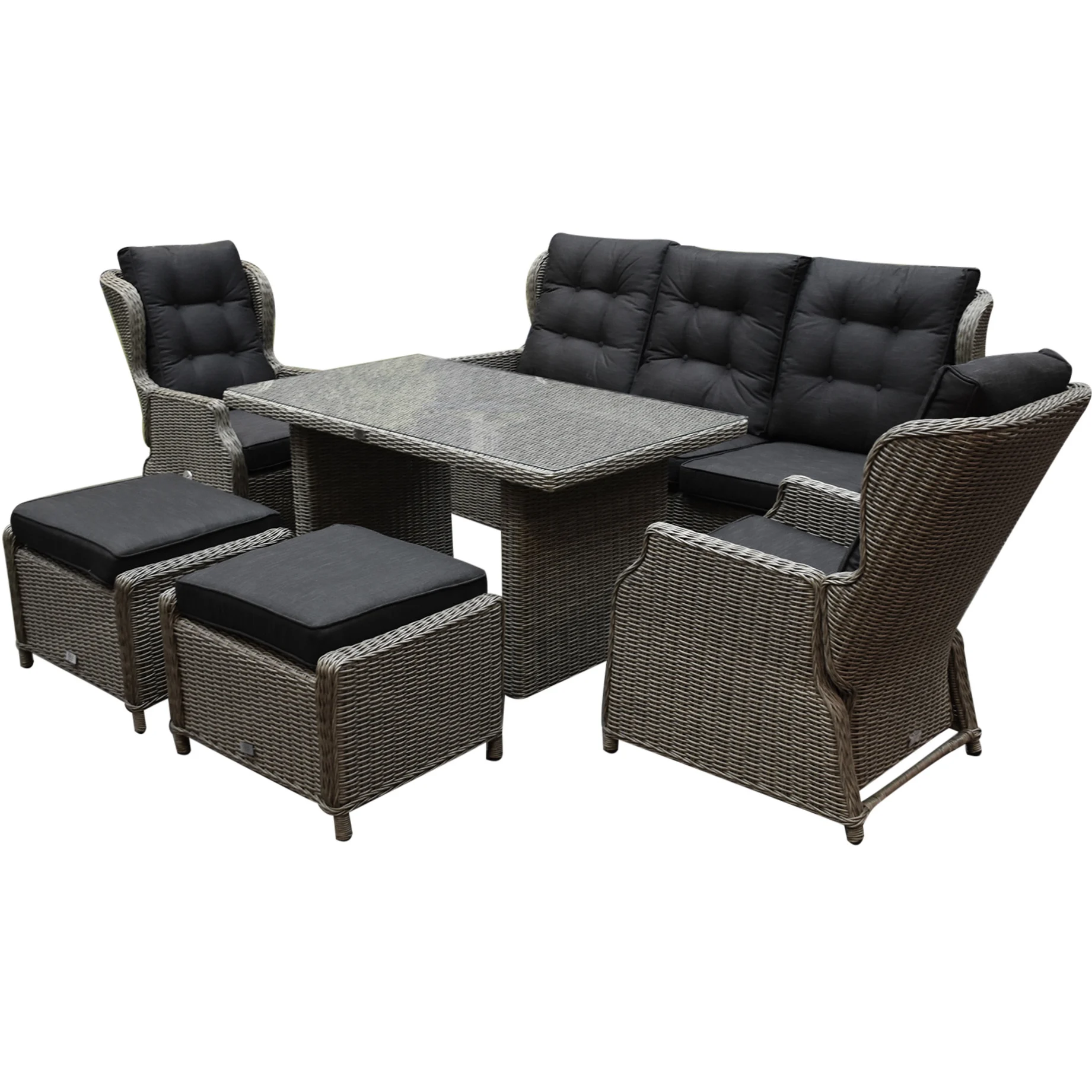 De Ibiza serie bestaat uit verschillende elementen. De Ibiza Xl stoel-bank loungeset bestaat uit een 3-zitsbank met verstelbare rugleuningen, 2 verstelbare lounge stoelen, 2 voetenbanken en een lounge dining tafel van 140x80xH71 cm.