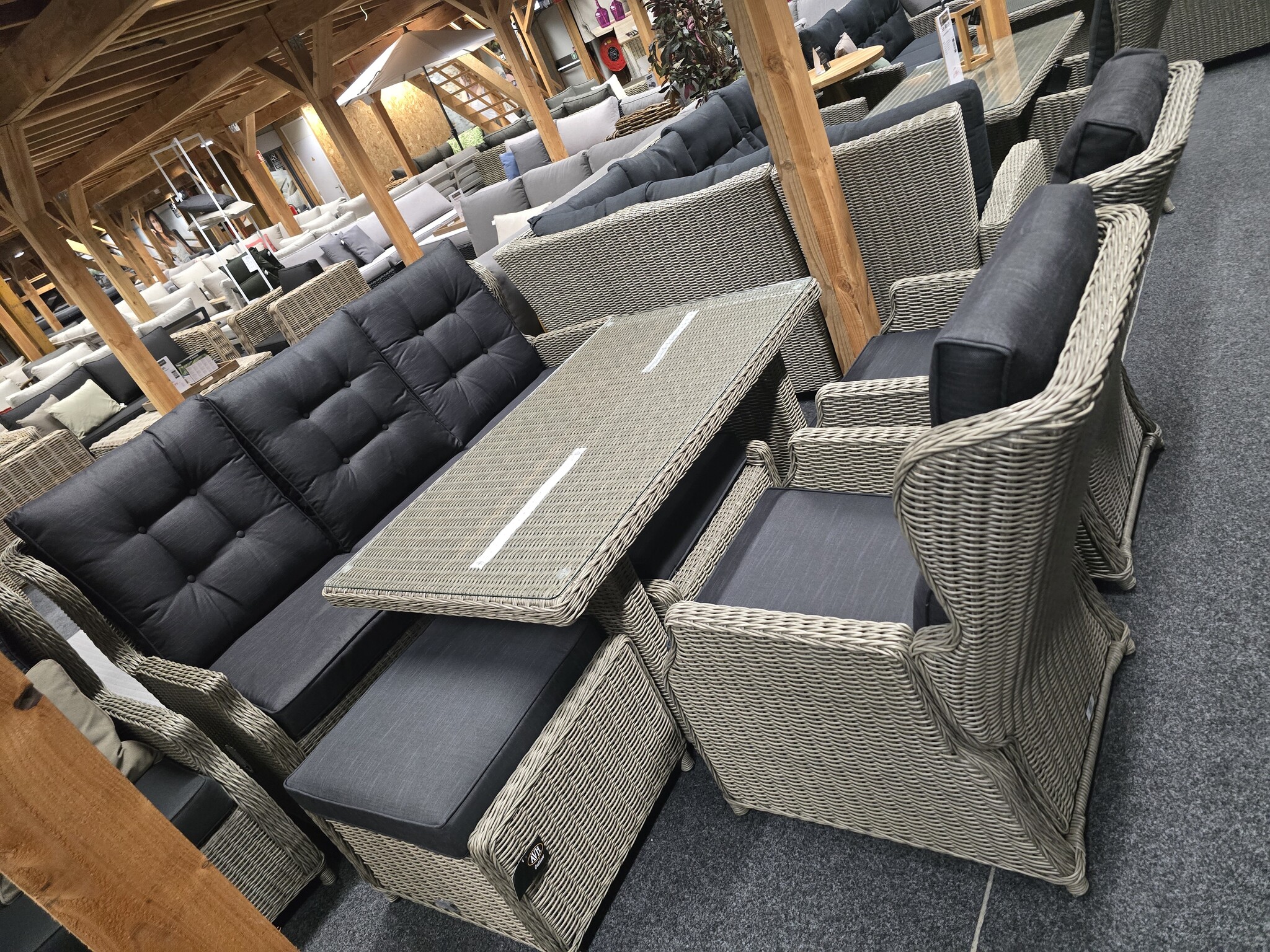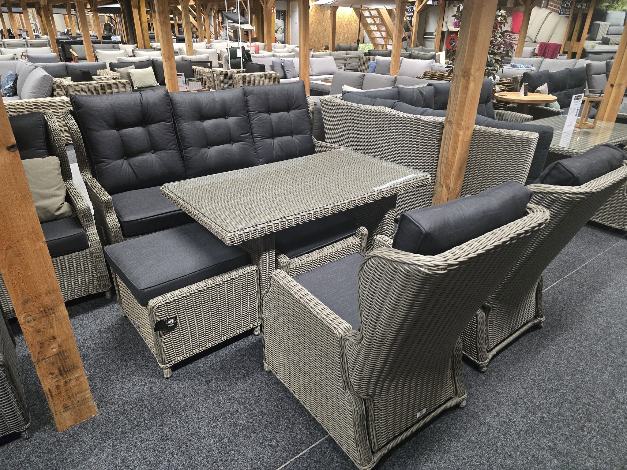 De Ibiza serie is van het merk AVH-Collectie. De Ibiza serie is gemaakt van kunststof vlechtwerk in de kleuren wit-grijs en kobo-grijs. De frames zijn gemaakt van aluminium en hebben een poedercoating gehad. De kussens zijn van polyester die afritsbaar en wasbaar zijn.