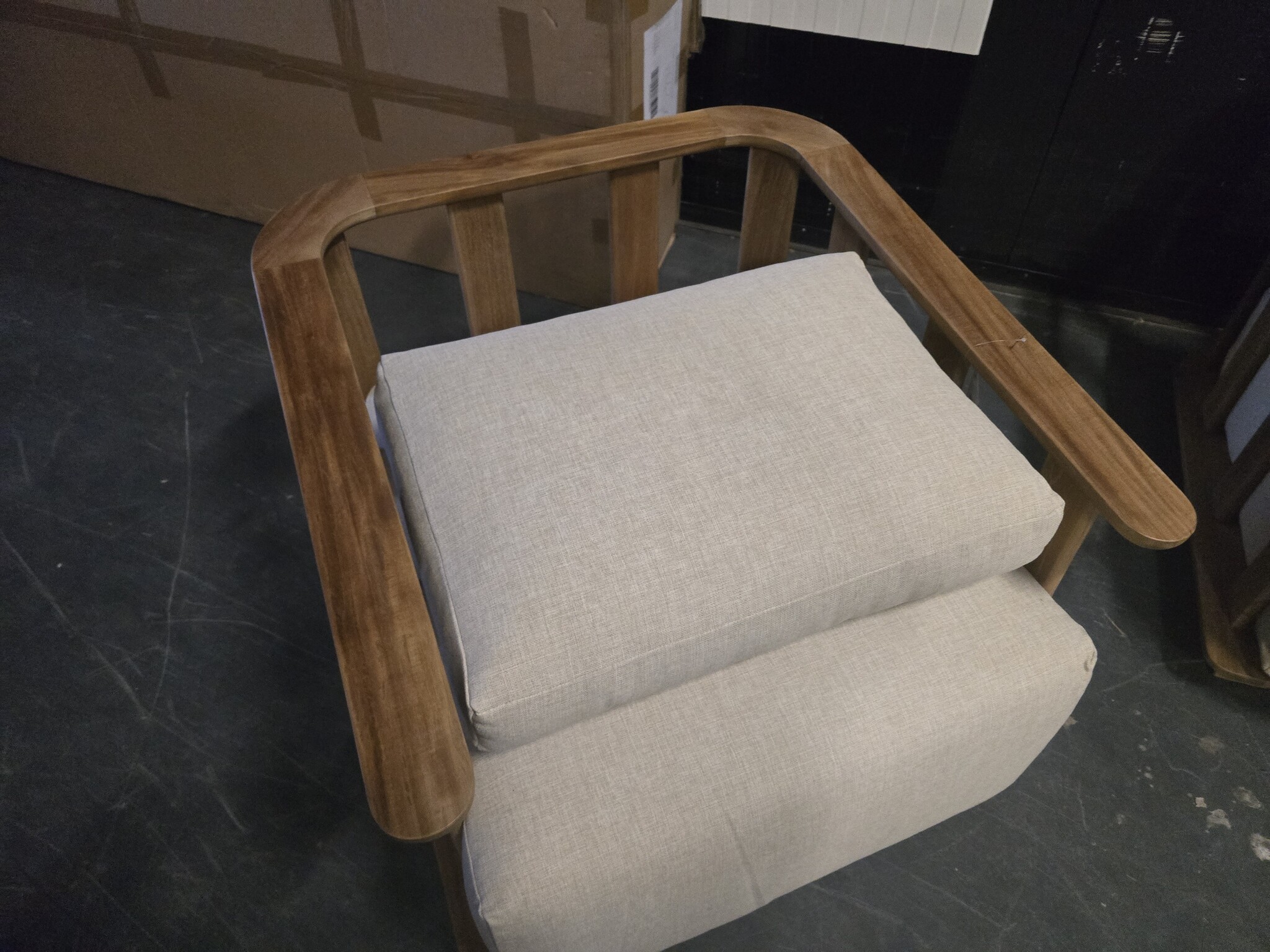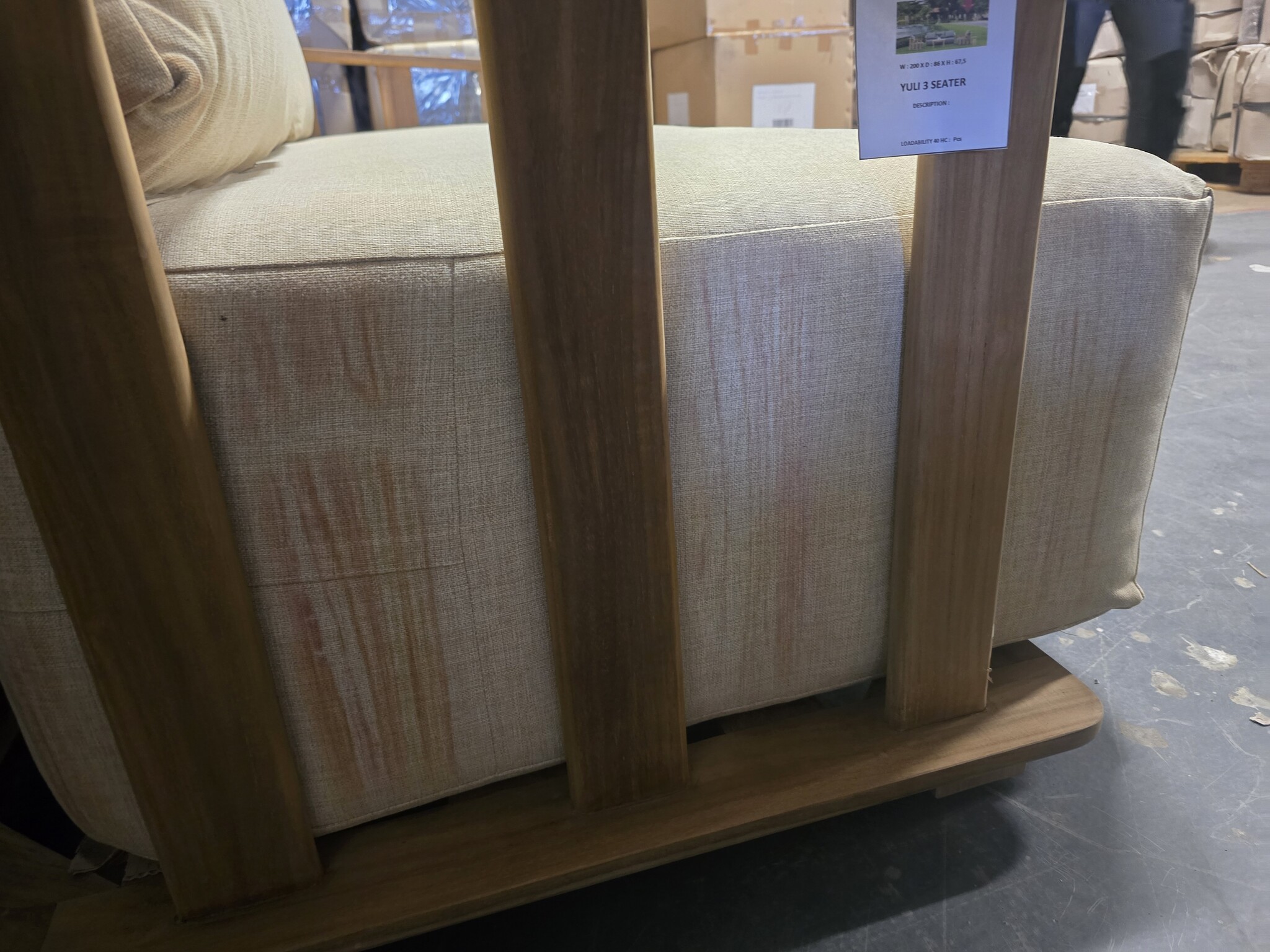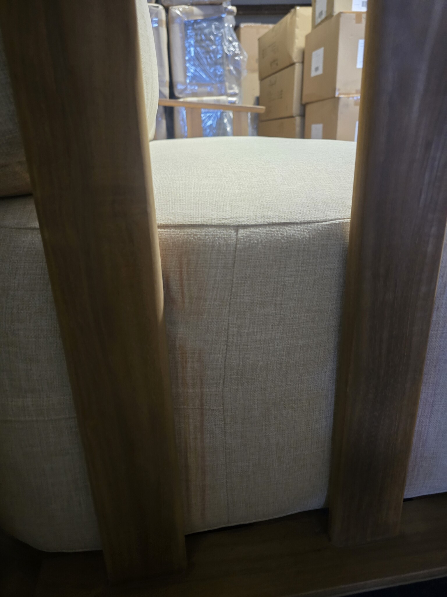 Deze aanbieding bestaat uit 1 bank en 1 stoel met lichtgekleurde kussens. De kussens vertonen op meerdere plekken teakvlekken, zowel op de zitkussens als op de rugkussens. Naar verwachting zijn deze vlekken te verwijderen, maar dit kunnen wij niet garanderen. De verkleuring bevindt zich onder andere op de plekken waar de kussens het teakhout raken.
