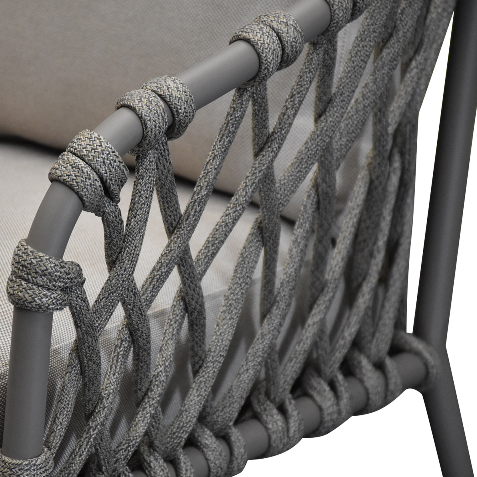 De bank is opgebouwd uit een stevig aluminium frame in een warme bruine tint, wat zorgt voor een robuuste, duurzame basis. De afwerking met zandkleurig rope geeft de bank een verfijnde, moderne look en biedt uitstekende weerbestendigheid. Hierdoor is de Monte Rosa 2-zitsbank bestand tegen uiteenlopende weersomstandigheden en geschikt voor jarenlang gebruik buiten.