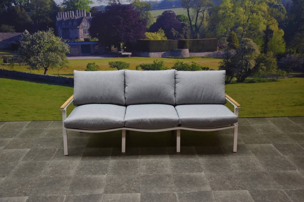 De Porto stoel-bank loungeset is van het merk AVH-Outdoor. De loungeset heeft een frisse uitstraling door het gebruik van wit aluminium in combinatie met teakhout.