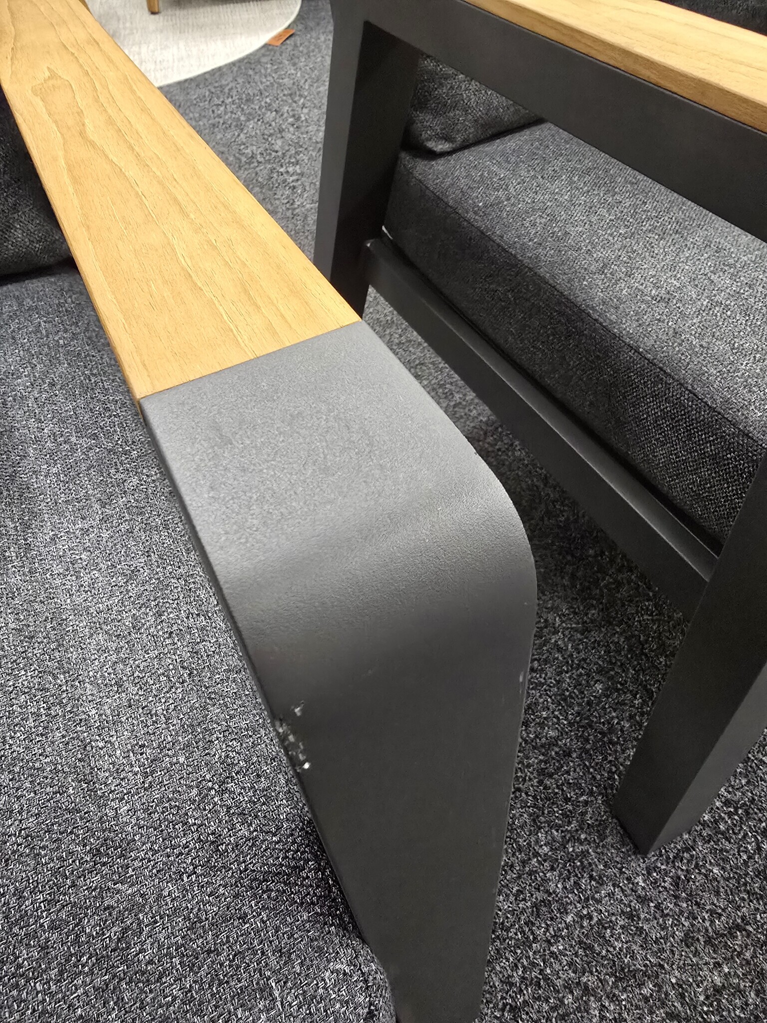 Het frame is gemaakt van onderhoudsvrij gepoedercoat aluminium in de kleur antraciet. De antraciete kleur is een tijdloze kleur die overal bij gezet kan worden. De armleuningen zijn voorzien van fsc teakhout. Dit geeft de Rochelle loungeset een luxueuze uitstraling. Een ander voordeel is dat de teak leuningen niet warm worden in de zon. Het teakhout zal mooi gaan vergrijzen door de zon. Wil je dit voorkomen adviseren wij om de teak delen te behandelen met teak protector.