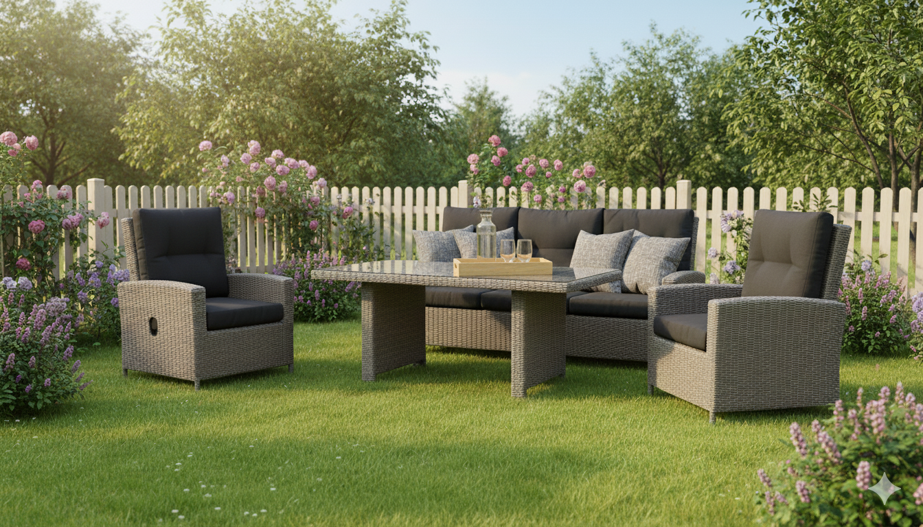In de tuin eten en relaxen, is vooral in de zomer één van de beste dingen die je kunt doen. Met deze lounge diningset kan dat heel goed. De hoogte van de tafel is precies afgestemd op de hoogte van de bank zodat je er goed kan eten. Ook zijn de stoelen verstelbaar, waardoor je fijn achterover kunt liggen in het zonnetje.