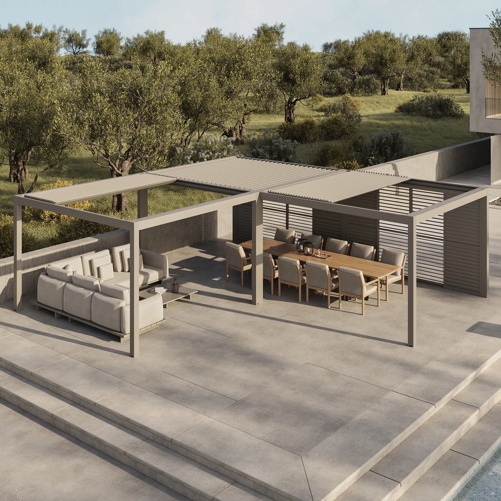 Het dak is elektrisch intrekbaar (retractable) en kan volledig naar één zijde worden opengeschoven. Met de afstandsbediening of app bepaal je moeiteloos de gewenste stand. Laat de zon volledig binnen, creëer verkoelende schaduw of sluit het dak bij wisselende weersomstandigheden. Regenwater wordt efficiënt afgevoerd via de poten van de constructie, zodat je altijd droog zit.
