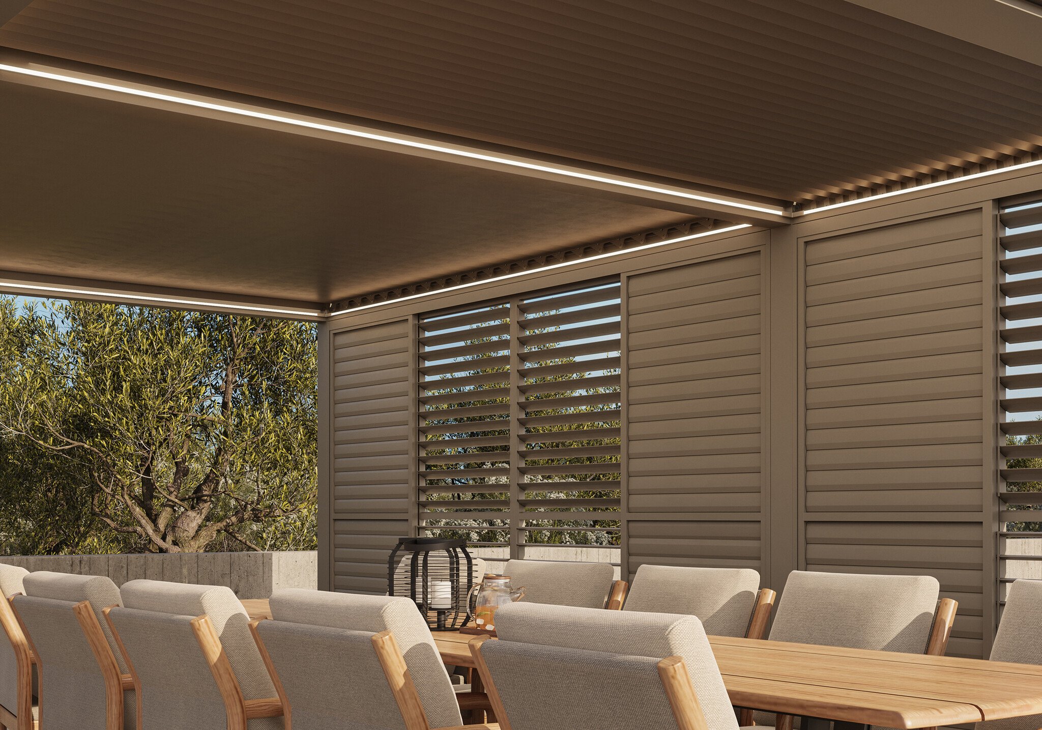 Het dak is voorzien van elektrisch verstelbare shutters, die je bedient met een afstandsbediening of via een app. Laat het zonlicht binnen, creëer verkoelende schaduw of sluit het dak volledig: jij bepaalt de sfeer. Dankzij de slimme waterafvoer via de poten blijf je bovendien altijd droog bij regen.