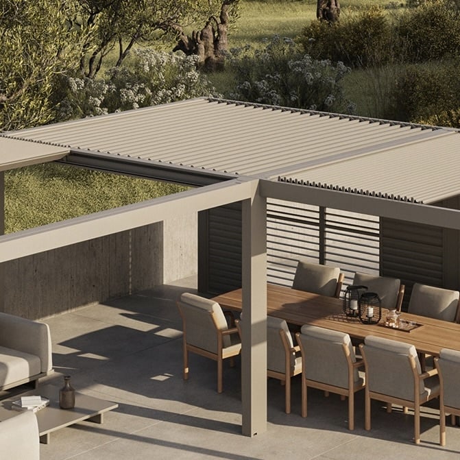 De zijverlenging is uitgevoerd in hetzelfde hoogwaardige design en dezelfde warme Camel Sand kleur als de originele gazebo. Hierdoor vormt de uitbreiding één strak en stijlvol geheel met de bestaande overkapping. Ideaal wanneer je extra ruimte wilt creëren voor een grotere eettafel, loungehoek of extra zitplaatsen.