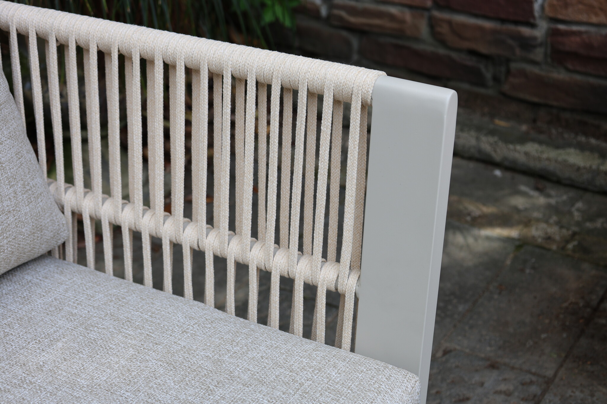 Het frame van de loungeset is vervaardigd uit hoogwaardig aluminium. Dit maakt de set niet alleen stevig, maar ook licht van gewicht, roestvrij en onderhoudsvriendelijk. De subtiele rope-afwerking aan de zijkanten voegt een speelse, luxe touch toe en zorgt voor een unieke uitstraling.