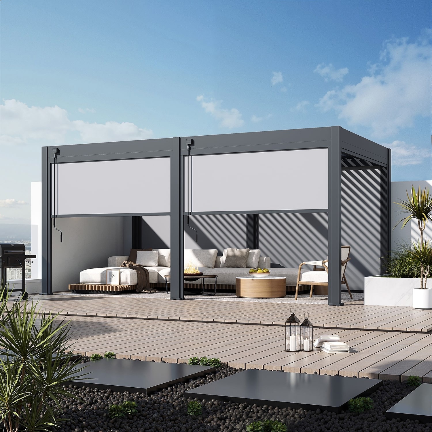 Verhoog het comfort van jouw Venus overkapping met het stijlvolle pull down windscherm in antraciet. Dit praktische zijscherm biedt niet alleen extra beschutting, maar zorgt ook voor meer privacy en een luxe uitstraling van je buitenruimte. Ideaal voor ontspannen momenten, ongeacht het weer.